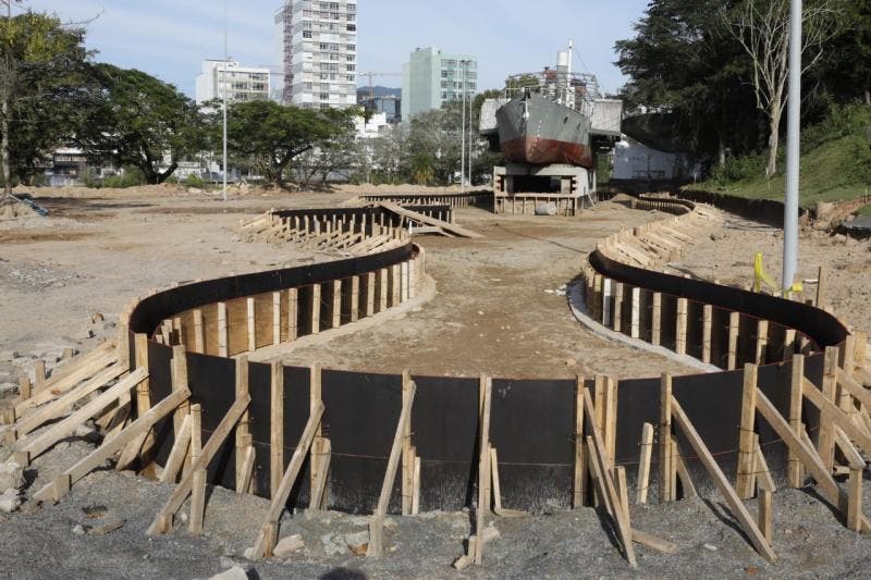 Tomou forma o espelho d’água que contornará a réplica do Vapor Blumenau na reforma da Prainha. A estrutura em concreto está pronta e a empreiteira responsável agora trabalha no sistema de drenagem e bombeamento de água. O reservatório é para simular que o barco flutua, cenografia em referência às embarcações que subiam o Itajaí-Açu durante a colonização.