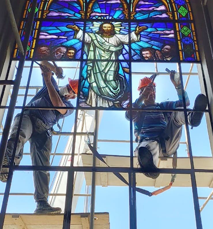 Dos vitrais existentes na igreja, os dois maiores foram desmontados, como um quebra-cabeças, e armazenados para a viagem de mil quilômetros. São peças fabricadas em 1930 pela Casa Conrado, o primeiro ateliê de vitrais brasileiro. A situação delas é mais delicada, porque estão abauladas — empenadas.