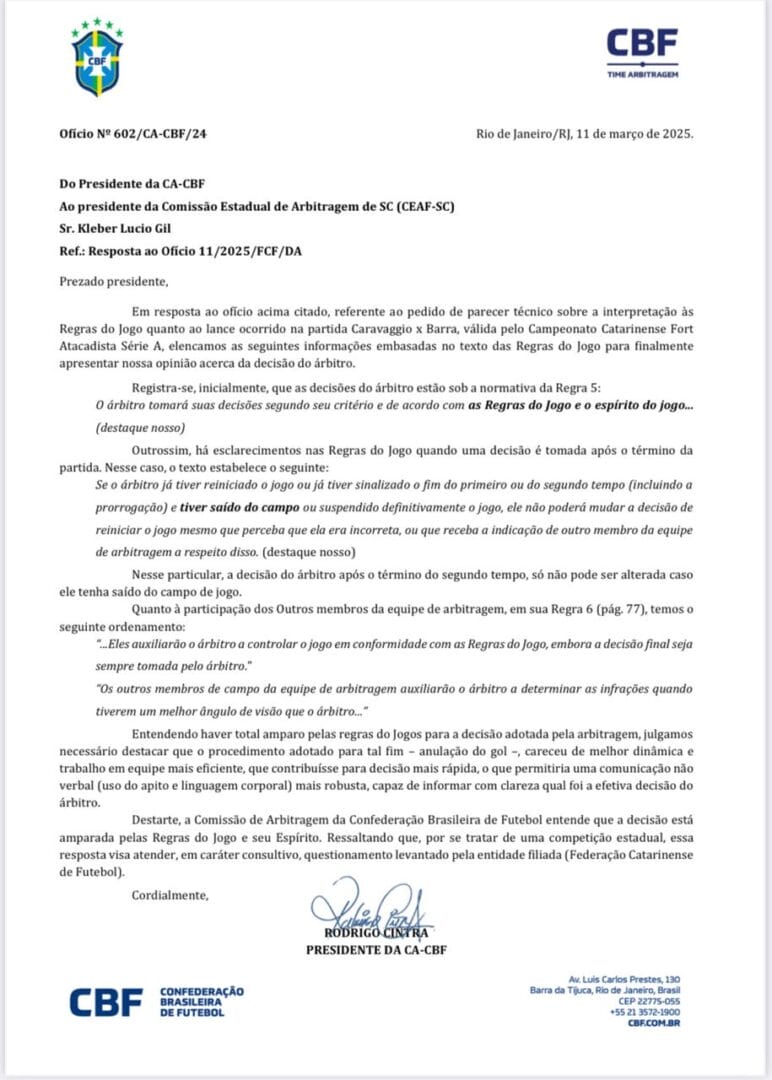 A Comissão de Arbitragem da Confederação Brasileira de Futebol entende que a decisão está amparada pelas Regras do Jogo e seu Espírito. Ressaltando que, por se tratar de uma competição estadual, essa resposta visa atender, em caráter consultivo, questionamento levantado pela entidade filiada (Federação Catarinense de Futebol).”