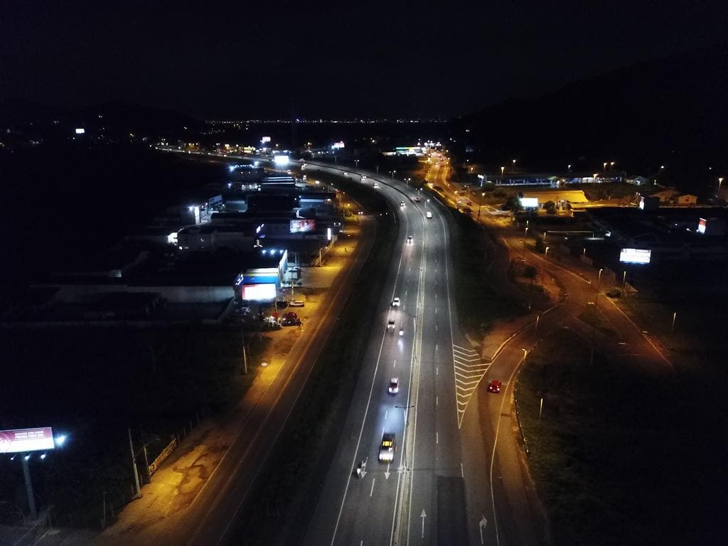 Boa parte SC 401, que liga o norte da Ilha ao centro de Florianópolis, está iluminada. As quase 728 luminárias de LED instaladas na rodovia foram ligadas nesta quinta-feira, dia 7. Ainda faltam instalar seis postes. Além da eficiência energética, as luminárias de LED também representam impacto mínimo ao meio ambiente, se comparadas às antigas lâmpadas de vapor de sódio.