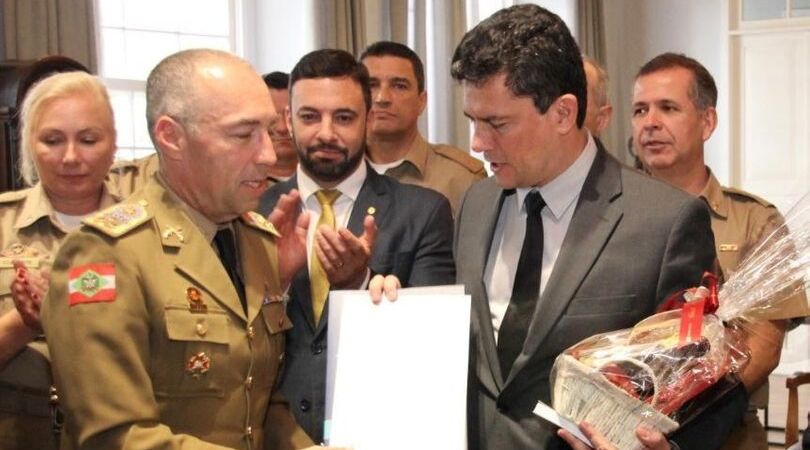 O ministro Sérgio Moro recebeu do coronel Araújo Gomes, presidente do Conselho Nacional de Comandantes Gerais das Policias Militares, uma moção de apoio ao pacote anticrime que está tramitando na Câmara Federal. As organizações militares se comprometem em respaldar a aprovação do projeto de Moro no Congresso Nacional. Na quinta-feira, o cel. Gomes estará no lançamento da campanha do governo federal a favor do pacote para combate à criminalidade.