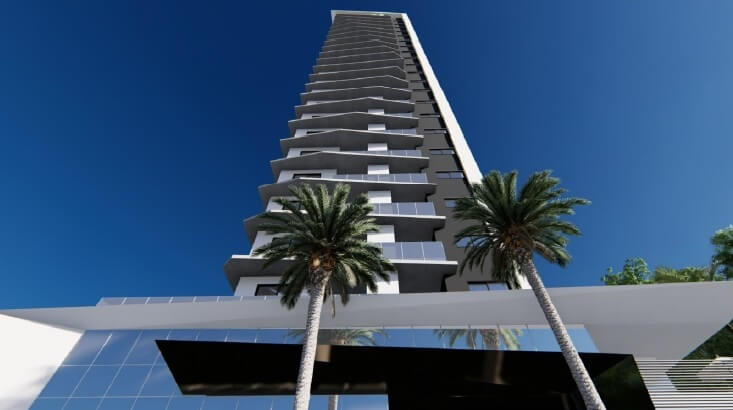 O projeto é da construtora OMA e contempla 20,7 mil metros quadrados de área construída em um terreno nos fundos da garagem da Viação Catarinense onde já existe uma edificação, mas que está desativada. Além dos 24 andares, estão previstos dois pavimentos de subsolo que devem abrigar a maior parte das 195 vagas de estacionamento previstas – haverá outras 172 para bicicletas.
