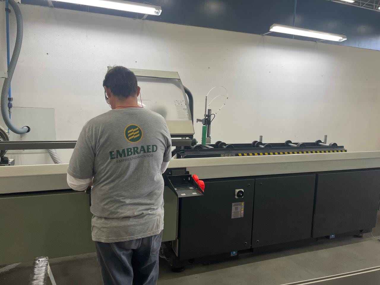 Na linha de esquadrias, a Embraed beneficia centenas de toneladas ao ano, e também é responsável pelo corte, usinagem, montagem e colagem dos vidros. No ateliê, pisos e porcelanatos comprados de marcas parceiras são recortados e viram detalhes que ornam áreas comuns dos prédios de luxo da construtora, como halls de entrada, piscinas e salas de jogos.