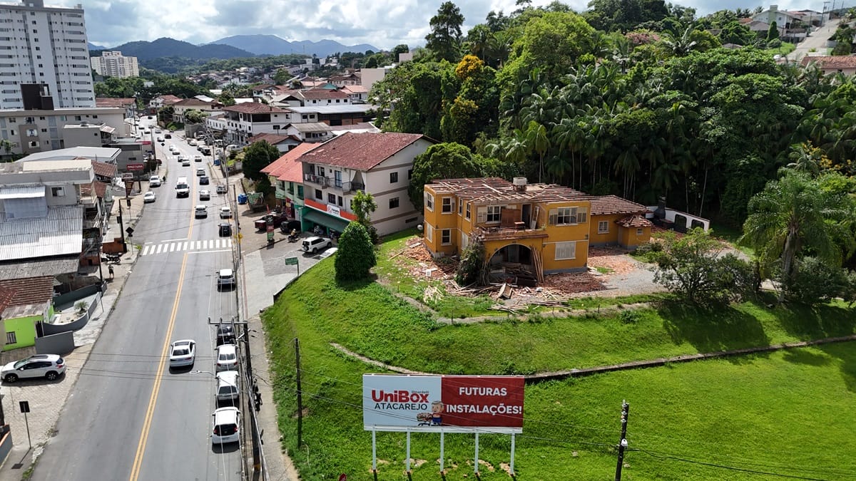 O famoso imóvel, construído na década de 1950 no bairro Fortaleza pela família Hutzelmann, começou a ser demolido para abrir espaço para uma nova operação de atacarejo.