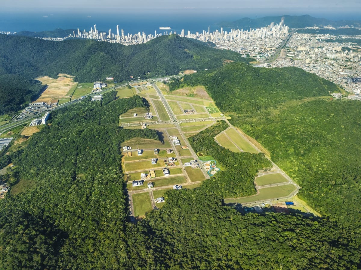 O pórtico de entrada com acesso pela Marginal Oeste da BR-101, a cinco minutos do Balneário Shopping, não dá a verdadeira dimensão do Colinas de Camboriú. Só imagens de drone são capazes de revelar a imensidão do bairro planejado de alto padrão cercado por uma vasta área verde, que contrasta com a verticalização frenética e o agito que se vê a poucos metros de distância do outro lado da rodovia.