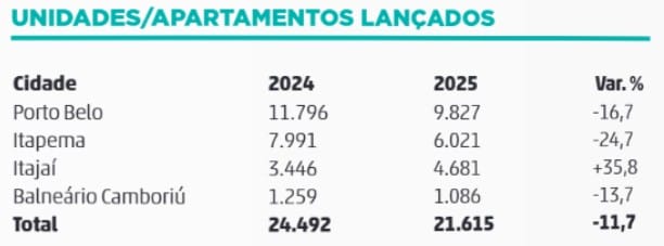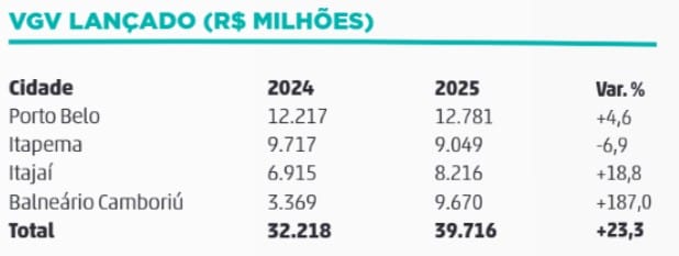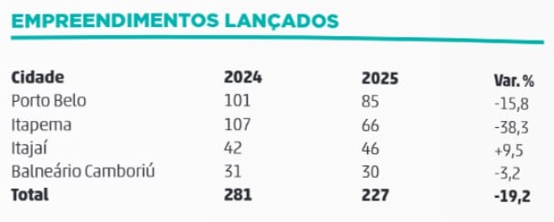 Em valores gerais, os novos lançamentos na região somaram R$ 39,7 bilhões em 2025, contra R$ 32,2 bilhões no ano anterior. Apenas em Itapema o indicador não subiu. Já em Balneário Camboriú, o crescimento foi de quase três vezes, indicando uma predominância de unidades de alto padrão, mais caras.