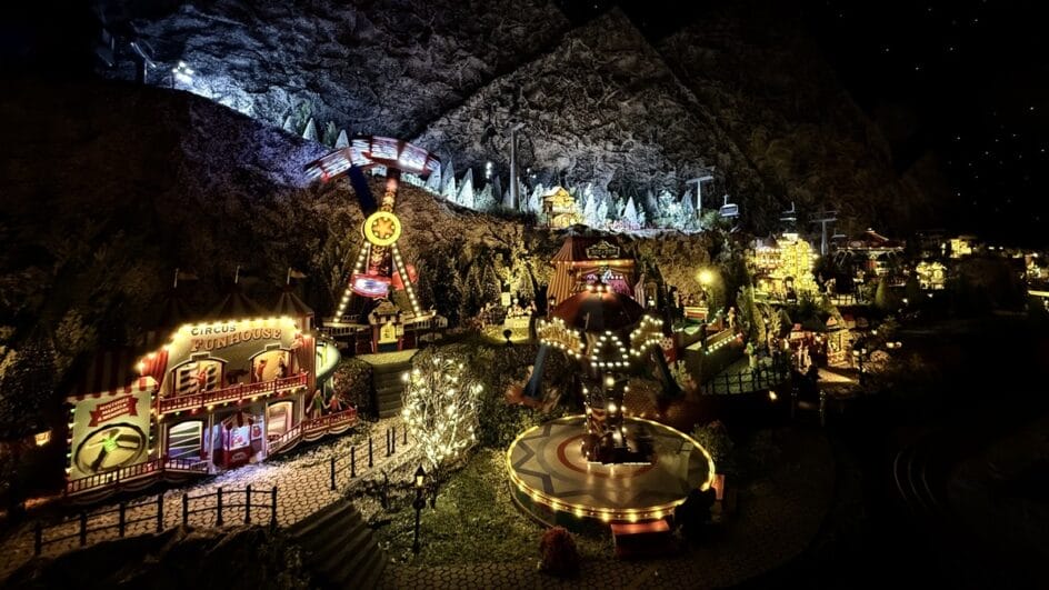 Entre os destaques estão uma Vila Vitoriana, com estética de época, a Cidade Alemã, que reforça a identidade cultural de Pomerode, e um cenário de montanhas nevadas, que inclui teleférico e esquiadores em movimento, além de uma loja de souvenires.