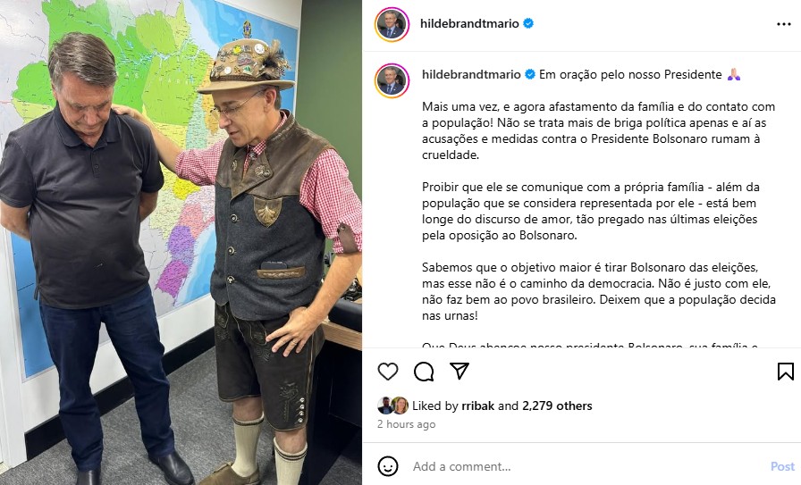 O ex-prefeito e atual secretário de Estado da Defesa Civil (PL), Mario Hildebrandt, publicou uma foto ao lado de Bolsonaro dizendo que estava em oração pelo ex-presidente. Para Hildebrandt, a situação não se trata mais de briga política e as medidas “rumam à crueldade”.