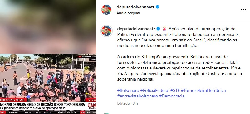 Em uma publicação nas redes sociais, o deputado estadual Ivan Naatz (PL) evitou emitir opinião e se limitou a fazer um pequeno resumo da decisão, citando uma declaração de Bolsonaro à imprensa mais cedo em que o ex-presidente afirma que “nunca pensou em sair do Brasil”.