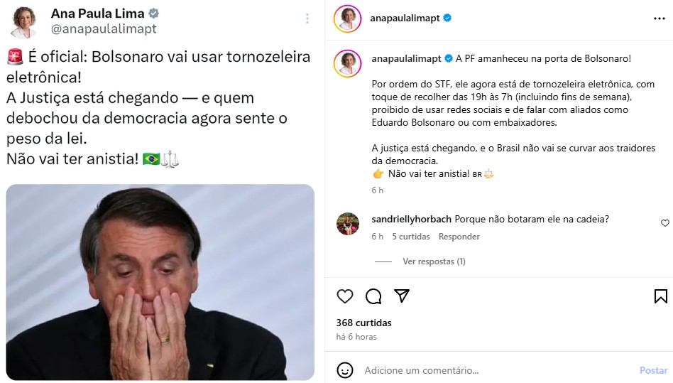 “A perseguição contra Bolsonaro e sua família só aumenta, mostrando o abuso de poder que está acontecendo”, escreveu Ferrari.