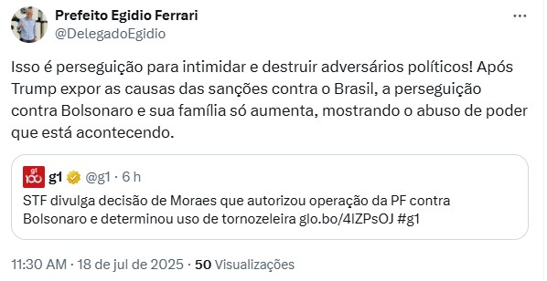 Em uma rede social, o prefeito Egidio Ferrari (PL) classificou a operação como “perseguição para intimidar e destruir adversários políticos” após o presidente americano, Donald Trump, expor as causas das sanções contra o Brasil.