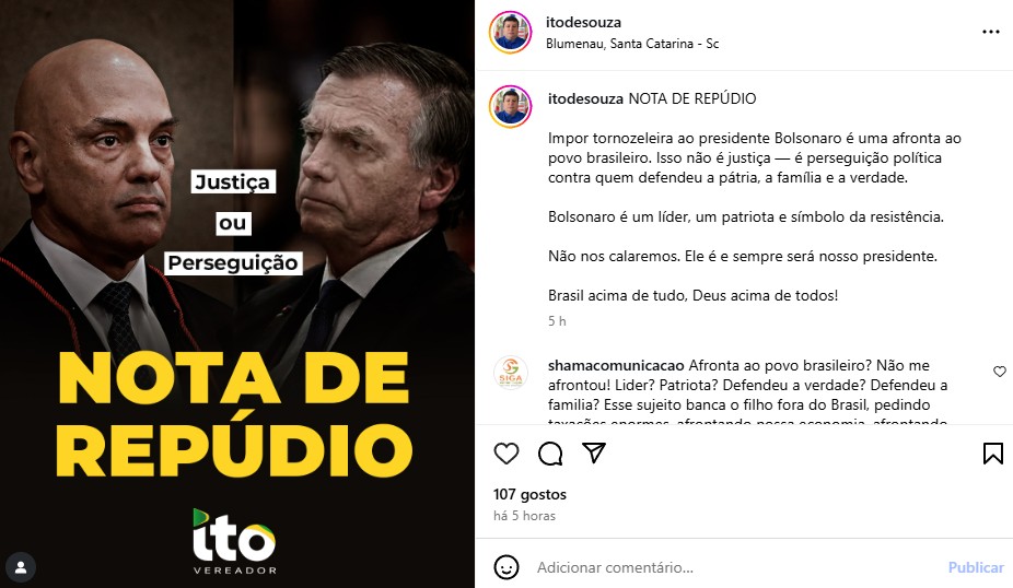 O presidente da Câmara de Vereadores, Ito de Souza (PL), disse que impor tornozeleira a Bolsonaro “é uma afronta ao povo brasileiro”, reiterando o discurso de perseguição contra “quem defendeu a pátria, a família e a verdade”