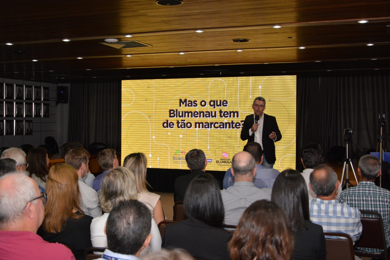 Diante de um Salão Nobre repleto de empresários do trade turístico, a prefeitura de Blumenau apresentou na manhã desta quarta-feira uma nova marca institucional: "Blumenau, a cidade dos grandes eventos".