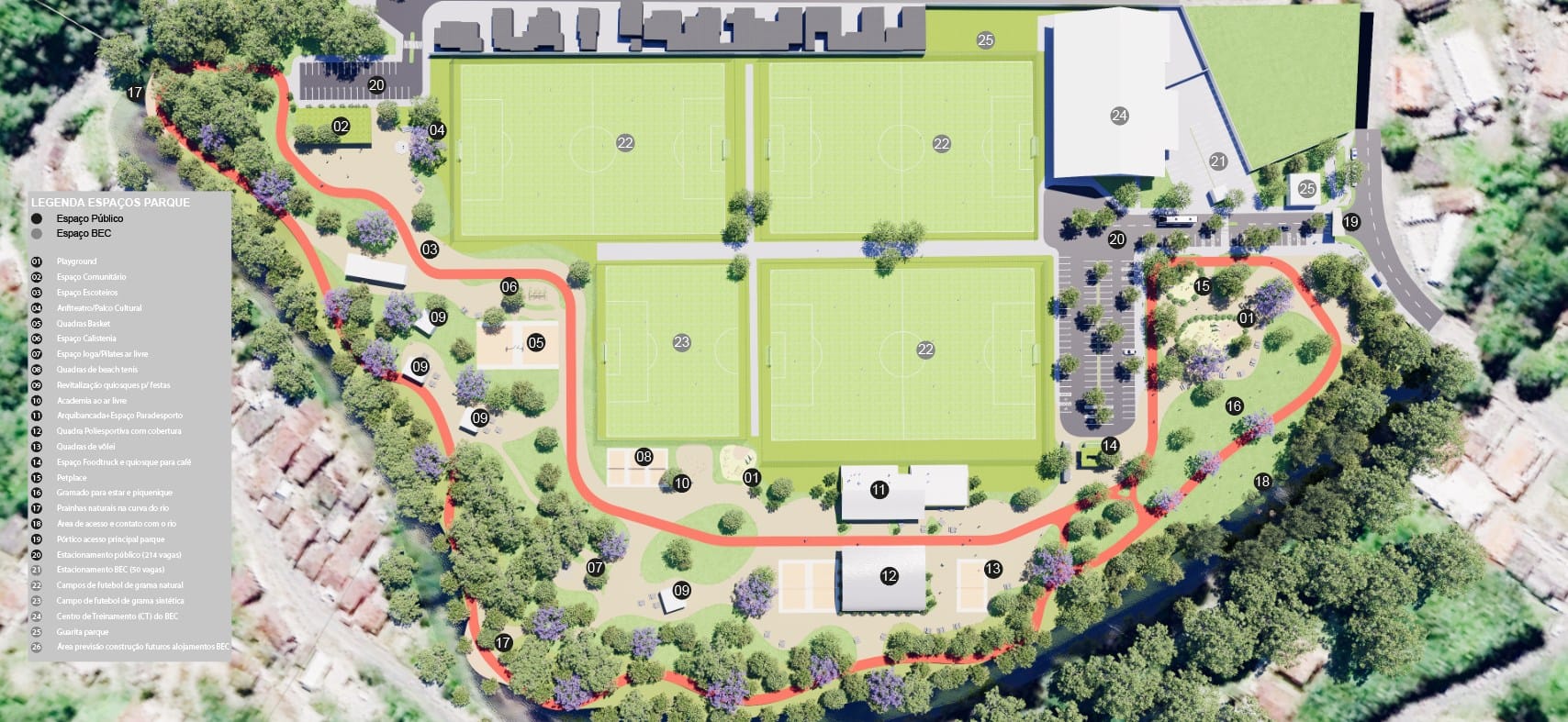 O projeto do BEC prevê a implantação de um moderno centro de treinamentos (CT) credenciado pela Fifa para formação de atletas. Imagens anexadas à proposta mostram um complexo com três campos oficiais de grama natural e outro com grama sintética. Um deles ocuparia a área onde hoje existe a piscina do complexo.