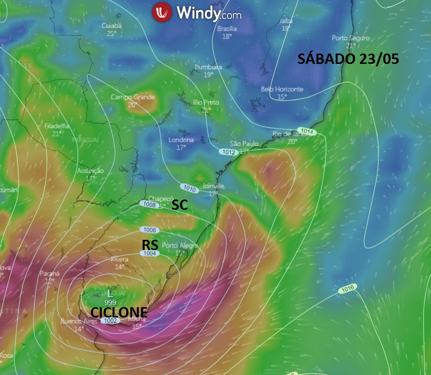Durante este fim de semana – 22 e 23/05 – teremos um ciclone na região entre Argentina, Uruguai e o Rio Grande do Sul. Esse ciclone não tem características de ser um bomba e também não tem movimento de avanço para Santa Catarina.