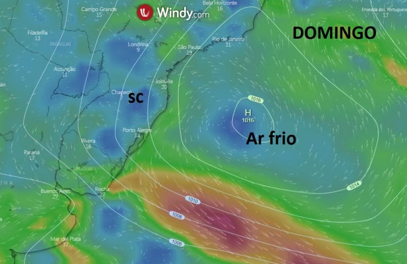 A presença de um ar seco já será a influência do tempo na maior parte de Santa Catarina neste sábado. Porém, o sol irá aparecer mais na faixa do Oeste até a Serra. Devido presença de um ar frio no oceano – como mostra a ilustração abaixo – o vento irá soprar do mar pelo quadrante sudeste. Isso ainda irá trazer umidade do oceano fazendo com que o Sul, o Litoral, o Vale do Itajaí e o Norte ainda tenham um dia com muitas nuvens e só algumas aberturas de sol.