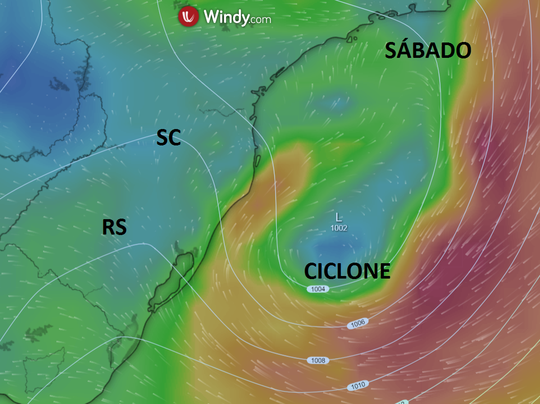 Ele ainda estará no mar na altura do RS como a ilustração mostra. Isso ocorre no sábado quando alguma rajada de vento moderada, não muito mais que isso, ainda deverá ocorrer do Sul a Grande Florianópolis. No mar atenção que as ondas seguirão grandes.