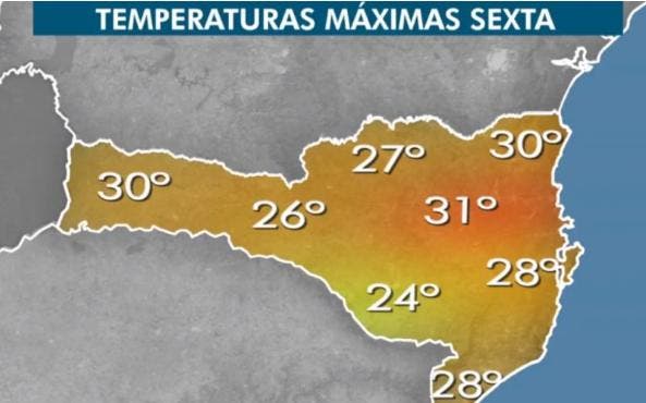 Ainda no decorrer da manhã, essas temperaturas vão subindo e trazem mais uma tarde com aquecimento, onde as máximas podem bater os 31°C no Vale do Itajaí e 30° em cidades do Oeste e do Norte do Estado.