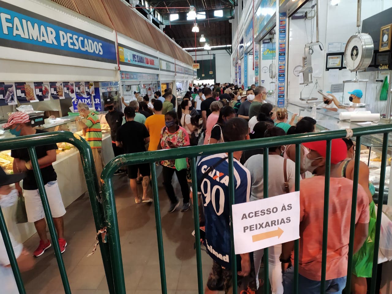 Nesta quinta-feira (1) houve aglomeração no Mercado Público de Florianópolis. Os clientes e trabalhadores estavam usando máscara, mas não houve respeito ao distanciamento social.