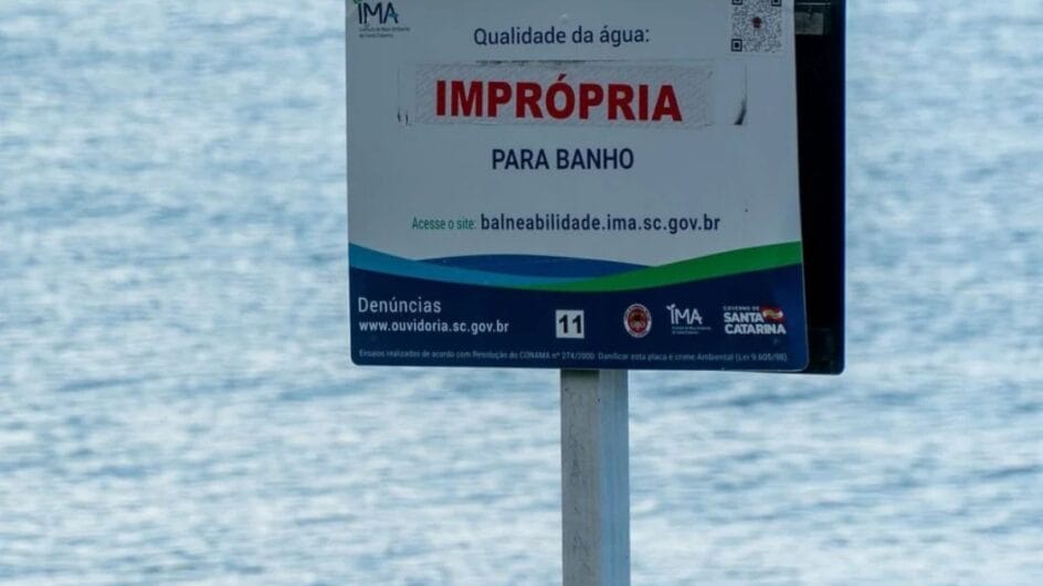 Placa indica condição imprópria de balneabilidade em praia em SC (Foto: Ricardo Wolffenbüttel/Secom SC)