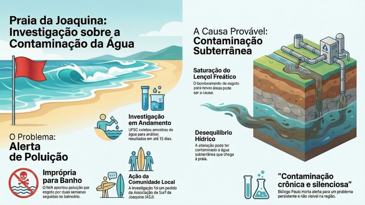 A possível contaminação das águas subterrâneas na Praia da Joaquina, em Florianópolis, está sendo investigada após o balneário apresentar índices de poluição por esgoto. Amostras foram coletadas na última quarta-feira (28) por uma equipe da UFSC, liderada pelo biólogo Paulo Horta, com previsão de resultados em até 15 dias após análise laboratorial.