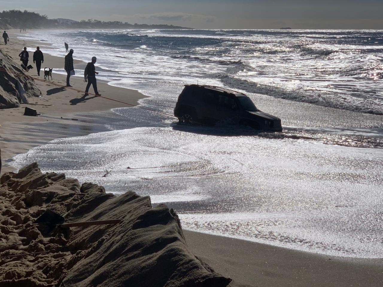 Os dois estavam bem assustados pois a maré já havia atingido o Jeep Renegade e havia o risco de ambos serem arrastados pelo mar.