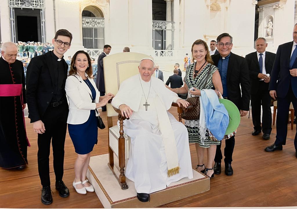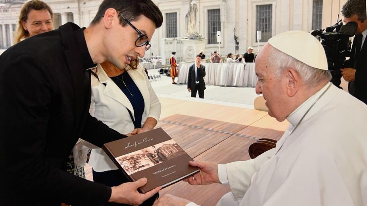Outro momento muito emocionante que tive com o papa Francisco, foi quando a minha mãe veio me visitar e entregamos a ele o livro comemorativo da minha cidade natal: Memórias da linha 11, retratando a presença da imigração italiana em Serafina Corrêa, rs.