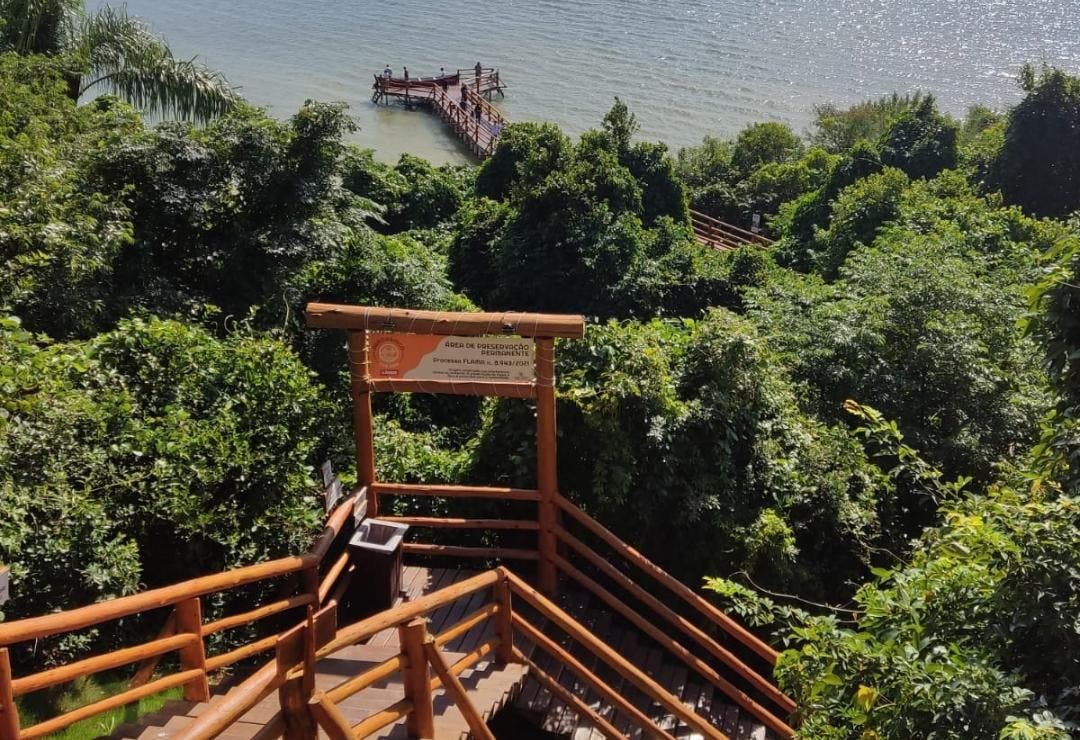 Mas o bacana mesmo é ir para a área externa onde há uma luneta gratuita para observação da ponte, dos barcos e da linda paisagem, espaço para fotos com suporte para deixar o telefone celular para facilitar a vida das famílias já com o enquadramento perfeito e um passarela de 80 metros de madeira, em meio à vegetação até a beira da lagoa. Um belo passeio.