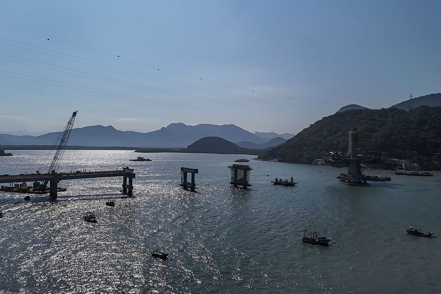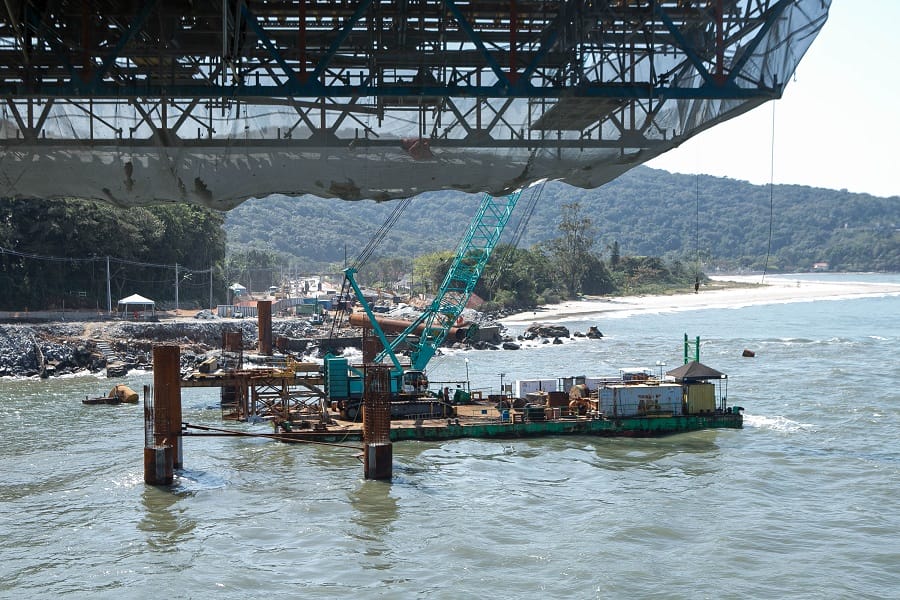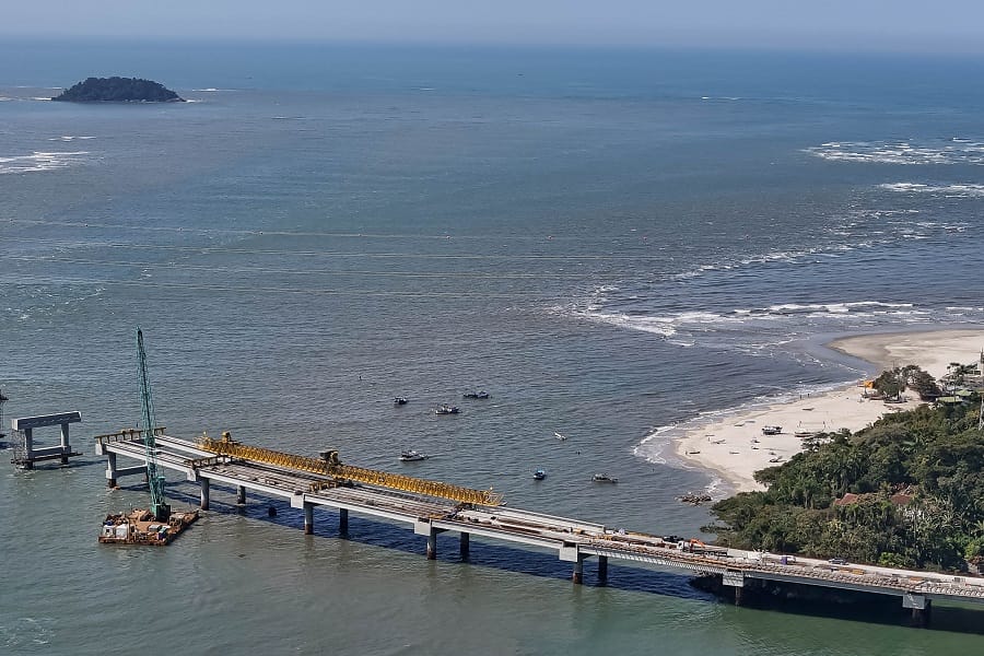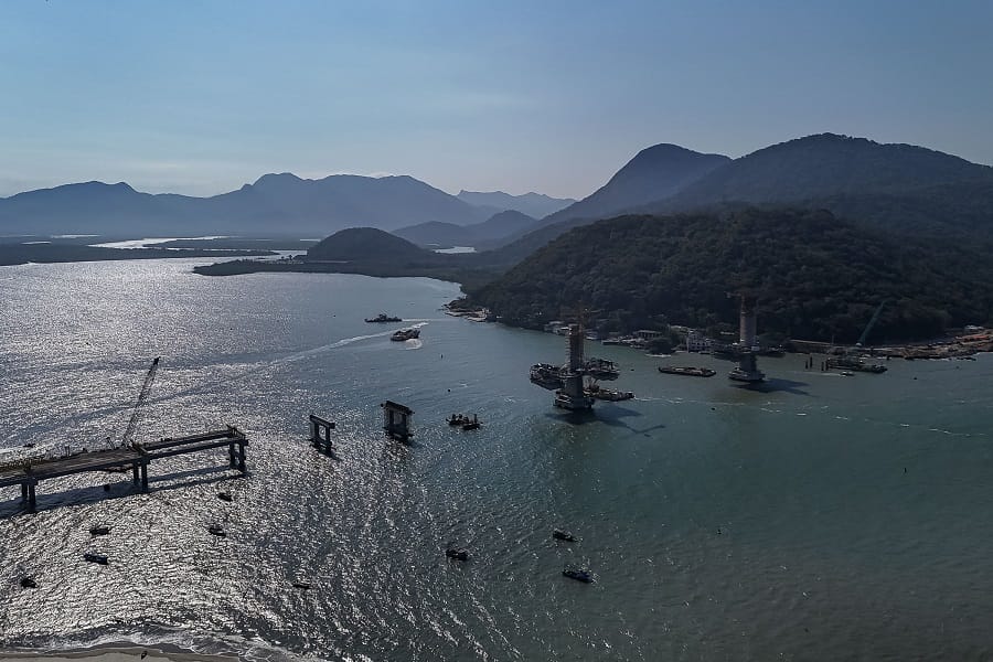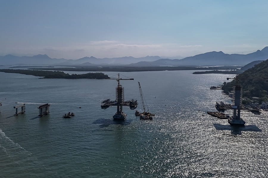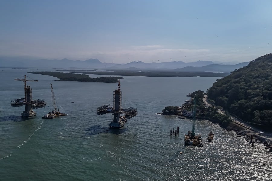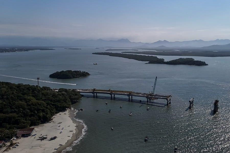 A construção da Ponte de Guaratuba iniciou nesta semana a instalação dos estais, os cabos de aço de sustentação do setor central da estrutura. O primeiro par de estais foi colocado, para suporte do tabuleiro – a estrutura horizontal por onde passam os veículos. A ponte de 1.244 metros de extensão entre Guaratuba e Matinhos deverá ser concluída em abril de 2026. Neste momento, a execução está em 70% do previsto, dentro do cronograma.