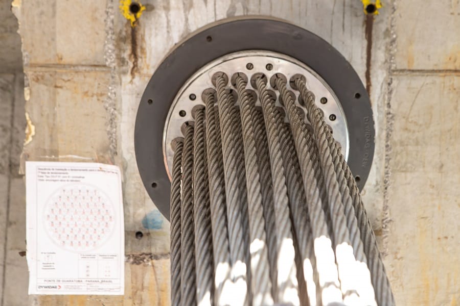 Na Ponte de Guaratuba, serão dois mastros principais, sendo que cada um deles terá 12 pares de. O estai é formado por um conjunto de cordoalhas, composta por sete fios de aço de alta resistência com três camadas de proteção anticorrosão: galvanização; aplicação de cera; e a capa de polietileno de alta densidade, conforme descrito pela divulgação do governo do Paraná.