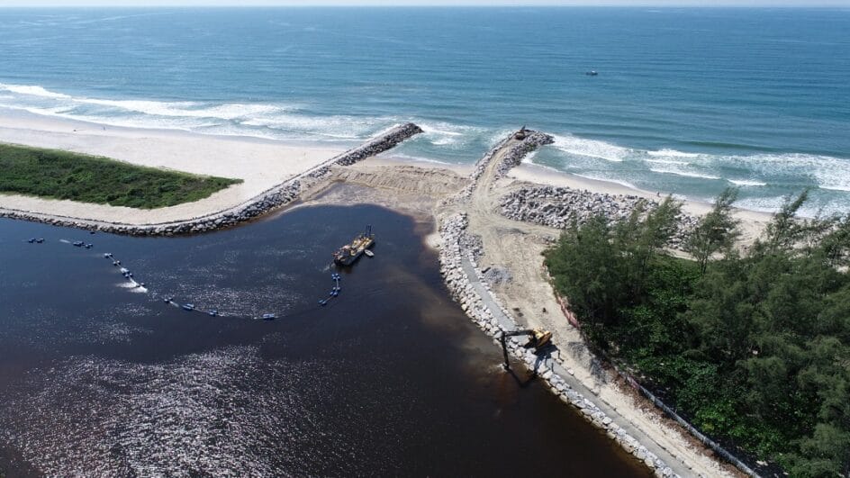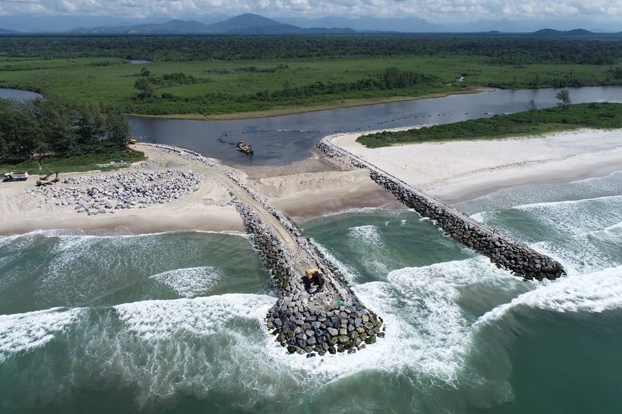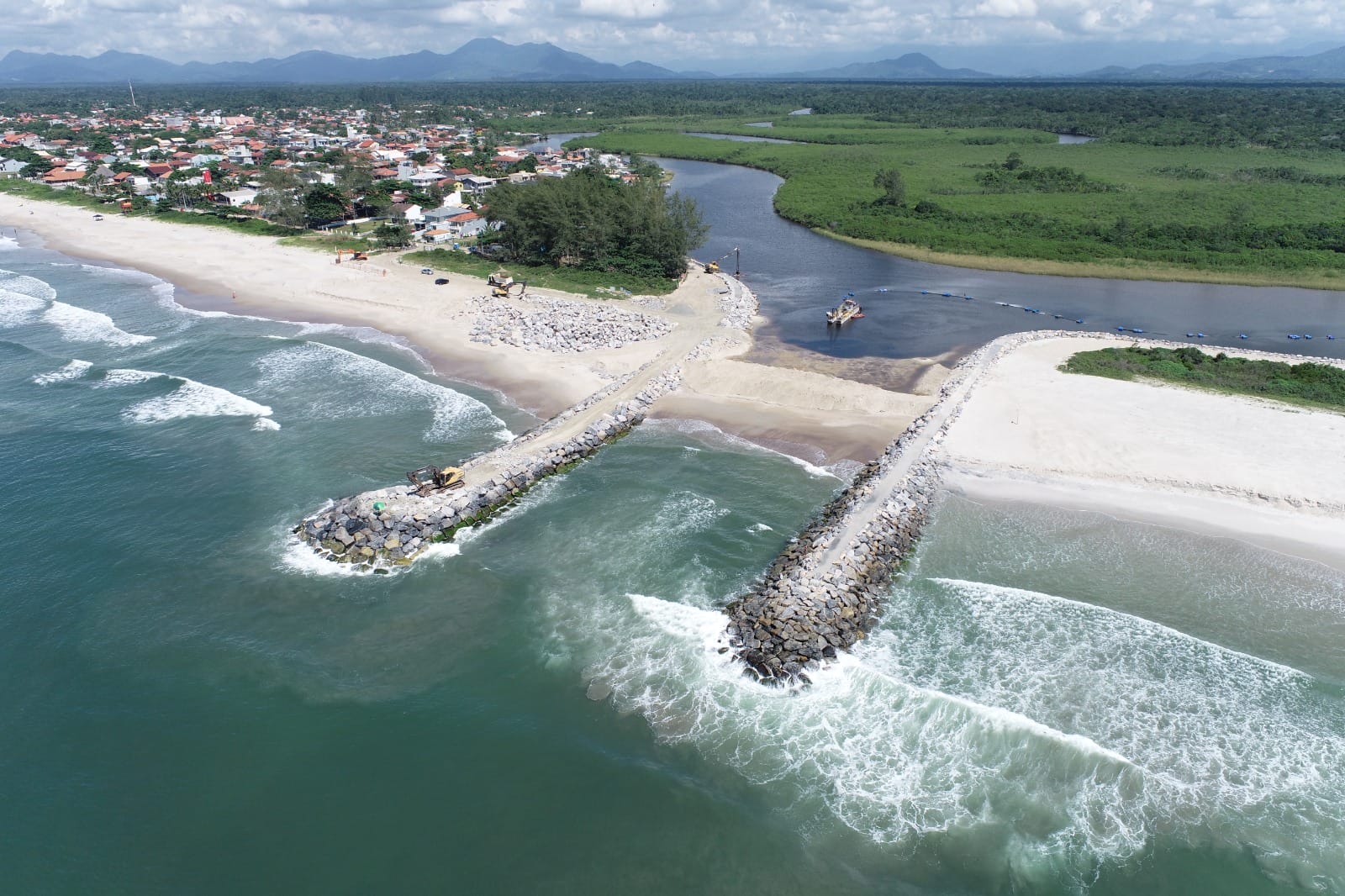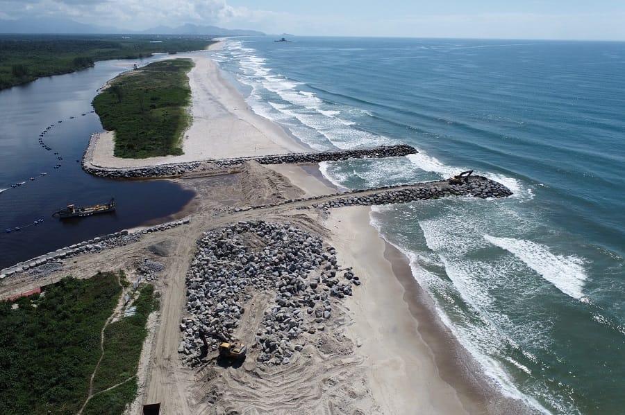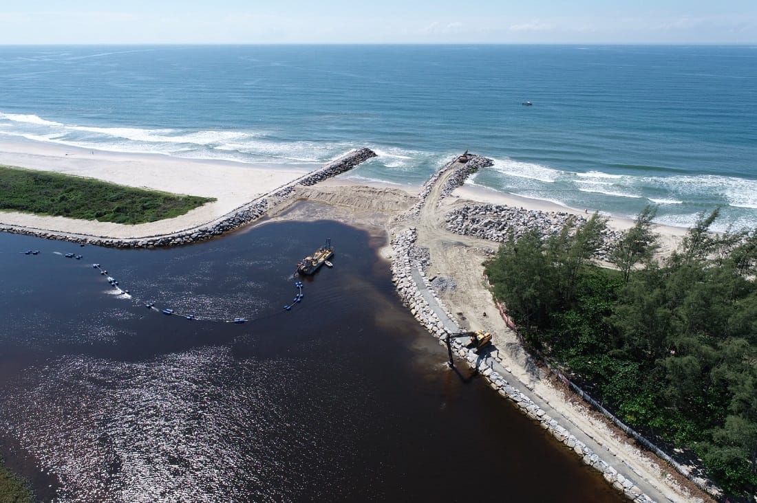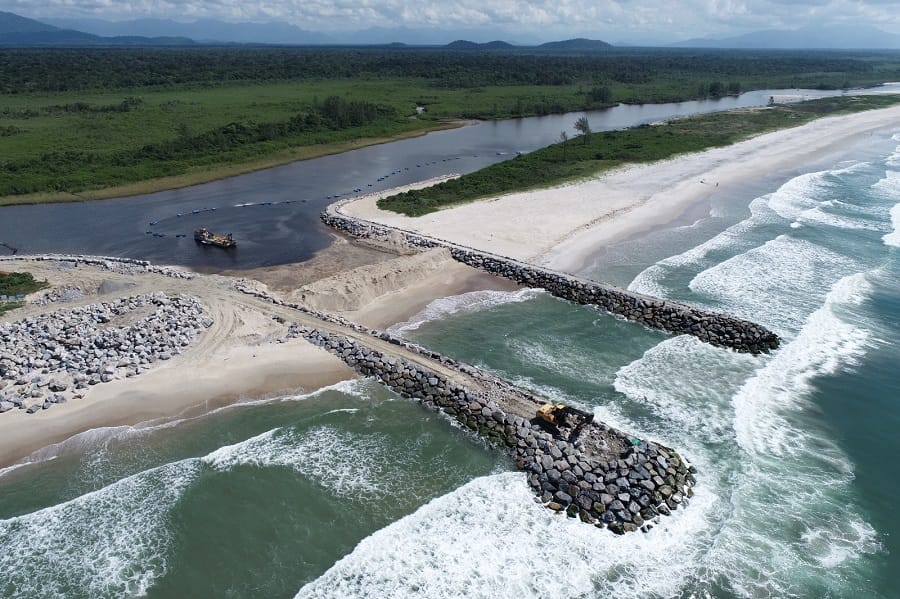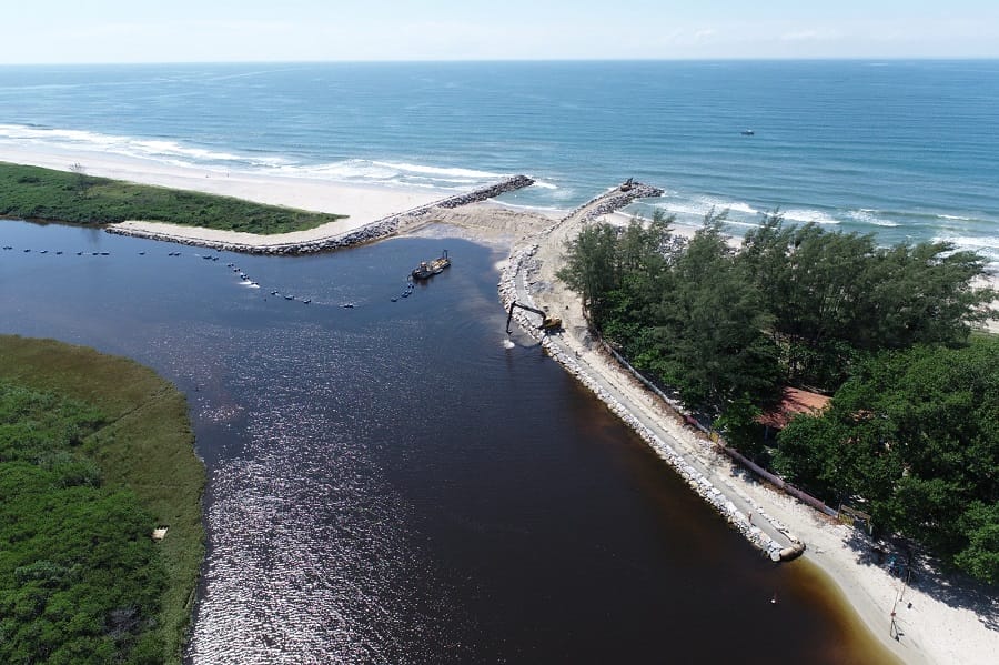 As obras dos novos molhes começaram em 2024, em investimento de R$ 16 milhões da prefeitura. A estrutura Norte de contenção, com 230 metros, foi concluída no ano passado e agora o molhe Sul, com 251 metros, está na fase final. Os dois molhes são separados por canal de navegação com largura de 40 metros. Além da nova barra, o trecho do rio passou por dragagem.