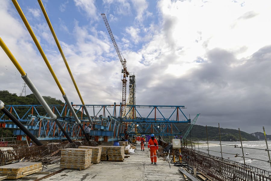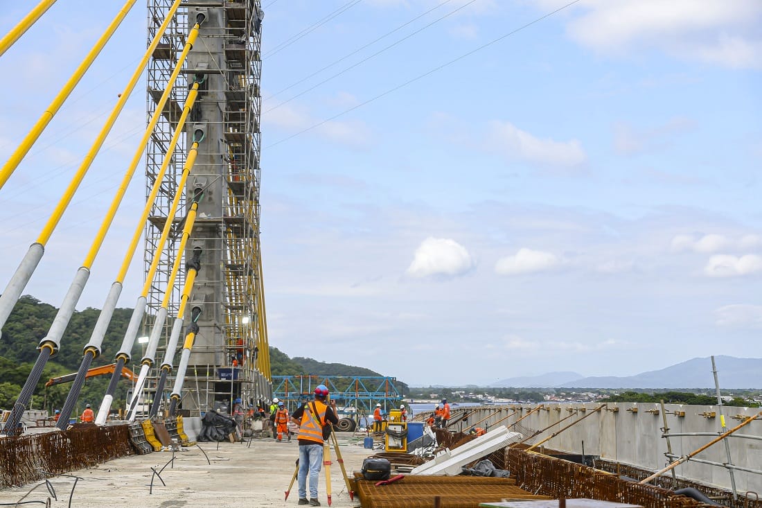 A instalação do último estai nesta sexta-feira deixou as obras da Ponte de Guaratuba mais perto do encontro entre as duas frentes de trabalho, no vão central. A formação do trecho contínuo deve ocorrer em março. O segmento estaiado dá sustentação ao vão central da ponte, além de já ser o marco visual da ligação entre Guaratuba e Matinhos. A ponte com 1.244 metros de extensão deve ser inaugurada em abril, em investimento de mais de R$ 400 milhões.