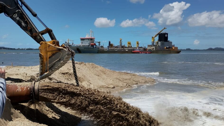 A recomposição costeira em Itapoá chegou a 40% do volume previsto de 5,8 milhões de metros cúbicos. A quantidade de areia a ser depositada da orla poderá ser maior porque o licenciamento ambiental autorizou 6,4 milhões de metros cúbicos. Dessa forma, o volume a ser utilizado em Itapoá será equivalente ao triplo de Balneário Camboriú. Ao todo, serão removidos mais de 12 milhões de metros cúbicos na dragagem da Babitonga – em torno de metade vai para bota-fora no oceano.