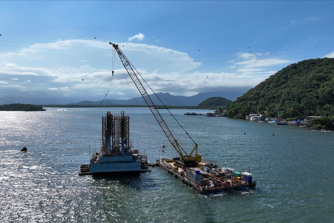 As bases do trecho estaiado da ponte estão em instalação em área central da baía de Guaratuba. A tarefa tem auxílio de grua fixa em apoio da ponte – o equipamento faz a movimentação de materiais. Até o início do ano, haviam sido instaladas 36 das 64 estacas previstas para a infraestrutura, distribuídas entre os trechos estaiado e pré-moldado.