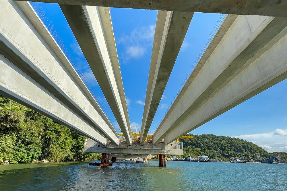O avanço das obras de construção da Ponte de Guaratuba está deixando mais visível o traçado da estrutura no Litoral do Paraná. As novas imagens divulgadas pelo governo paranaense mostram a colocação das vigas longarinas. Há frentes de trabalho também na requalificação dos acessos. Até agora, perto de 40% das obras foram executadas, com previsão contratual de conclusão em abril de 2026. O custo é de R$ 387 milhões.