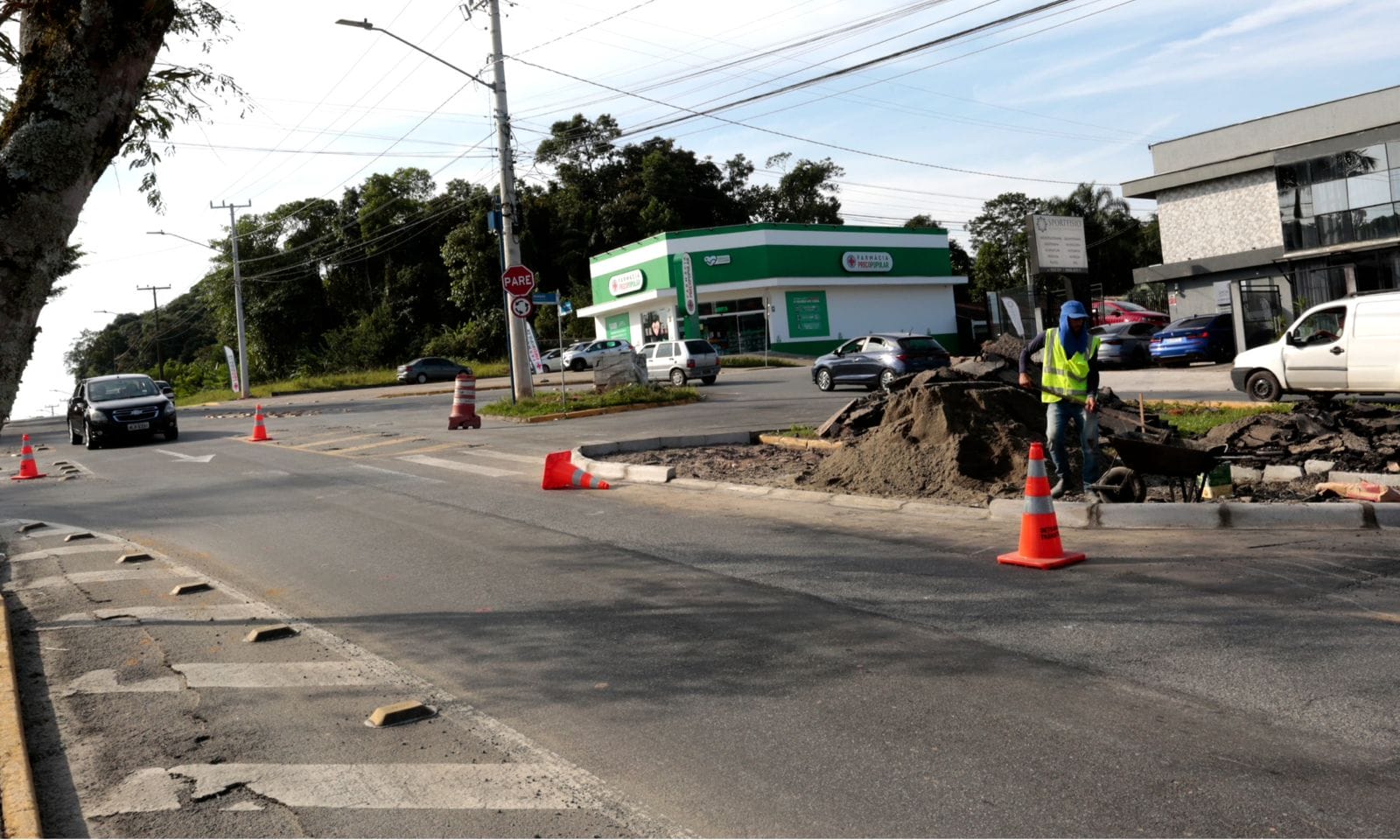 A minirrotatória da avenida Marquês de Olinda com a rua João Pessoa, em Joinville, está passando por mudanças e vai virar rotatória. As obras estão em andamento e devem ser concluídas em julho. A ampliação do cruzamento na zona Norte faz parte do termo de compromisso de estudo de impacto de vizinhança de empreendimento na vizinhança (EIV), com orientação da prefeitura.