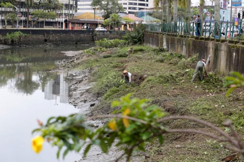 A roçada e limpeza de detritos no trecho em frente à sede da prefeitura é uma das etapas de manutenção periódica do rio. Outros pontos do Cachoeira receberam o serviço. No caso do local com trabalhos iniciados nesta semana, o serviço é manual. Em outros pontos, há o uso de máquinas.