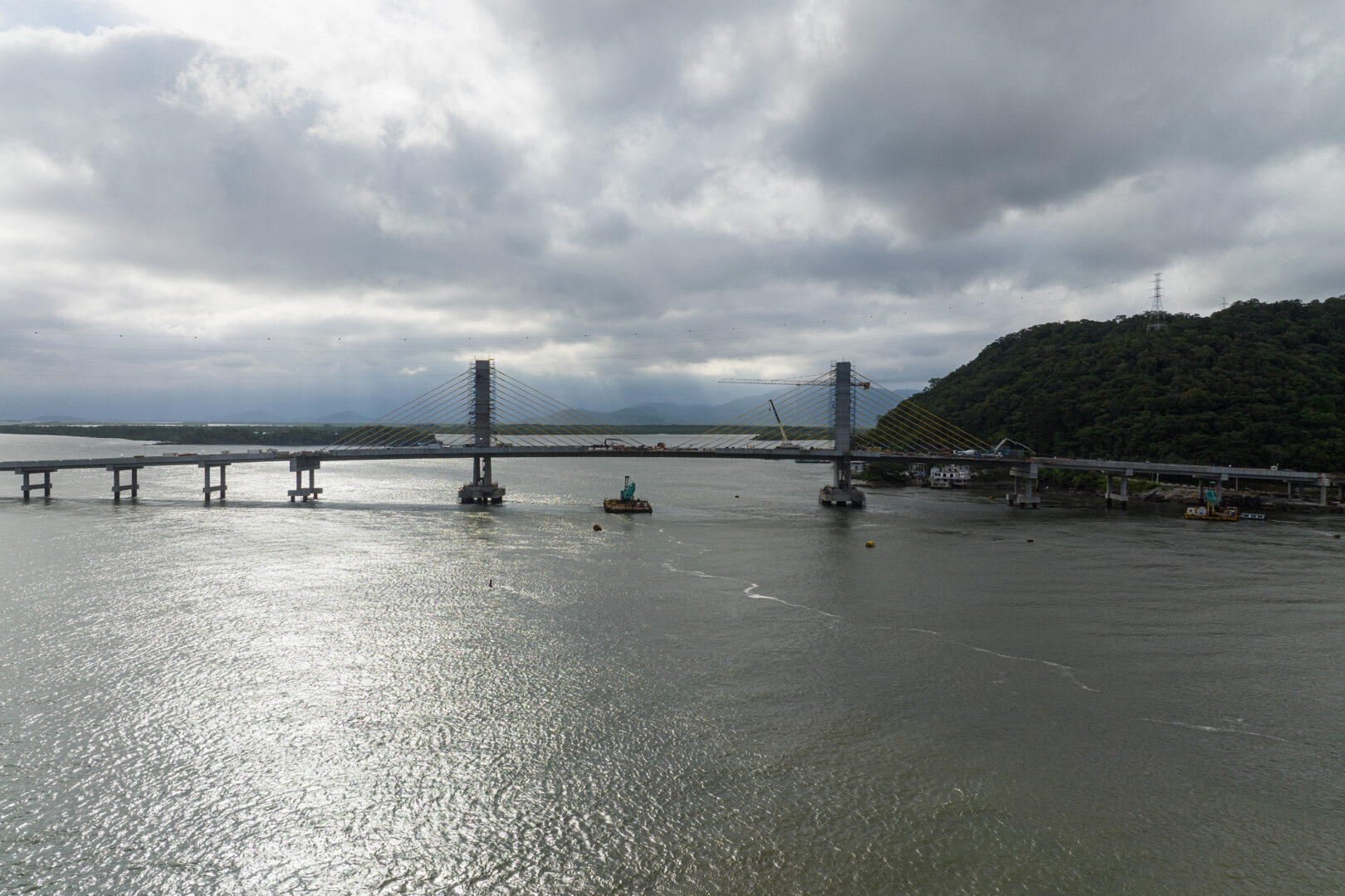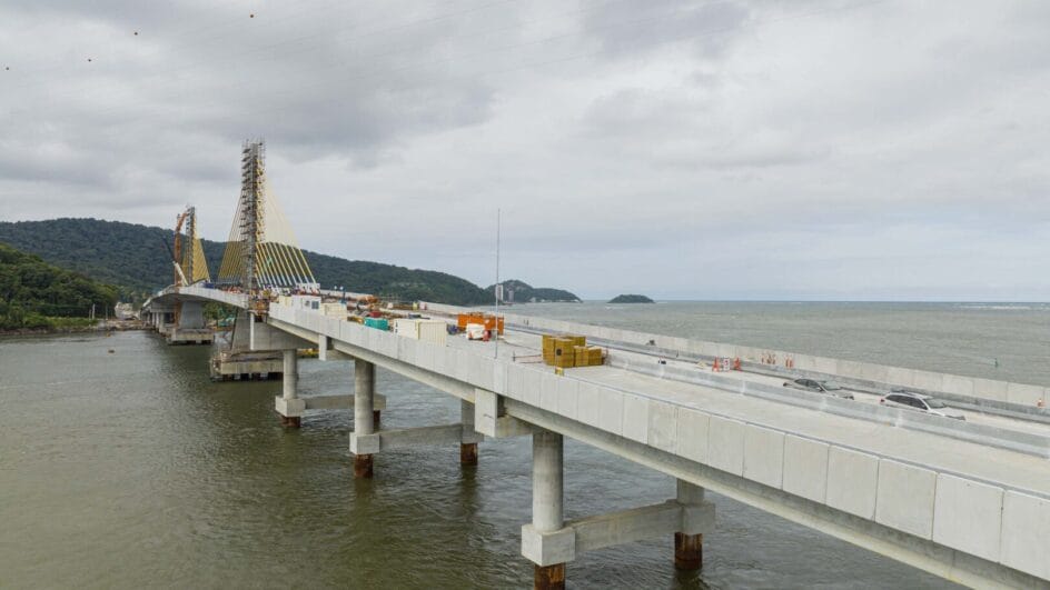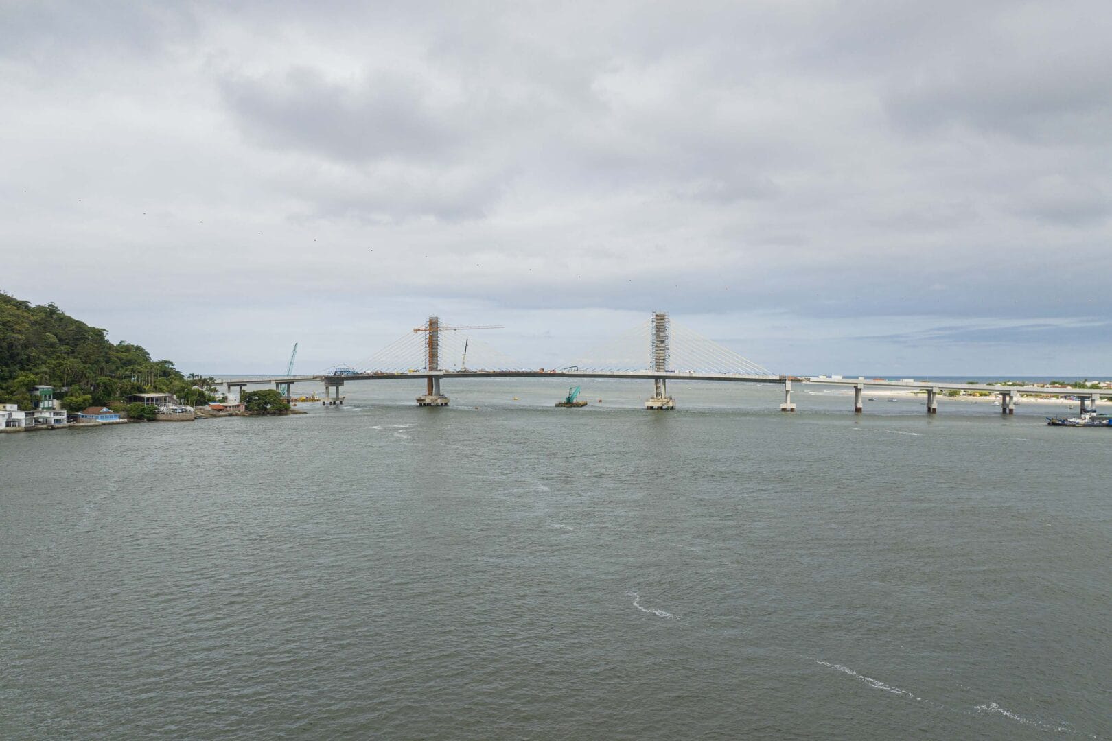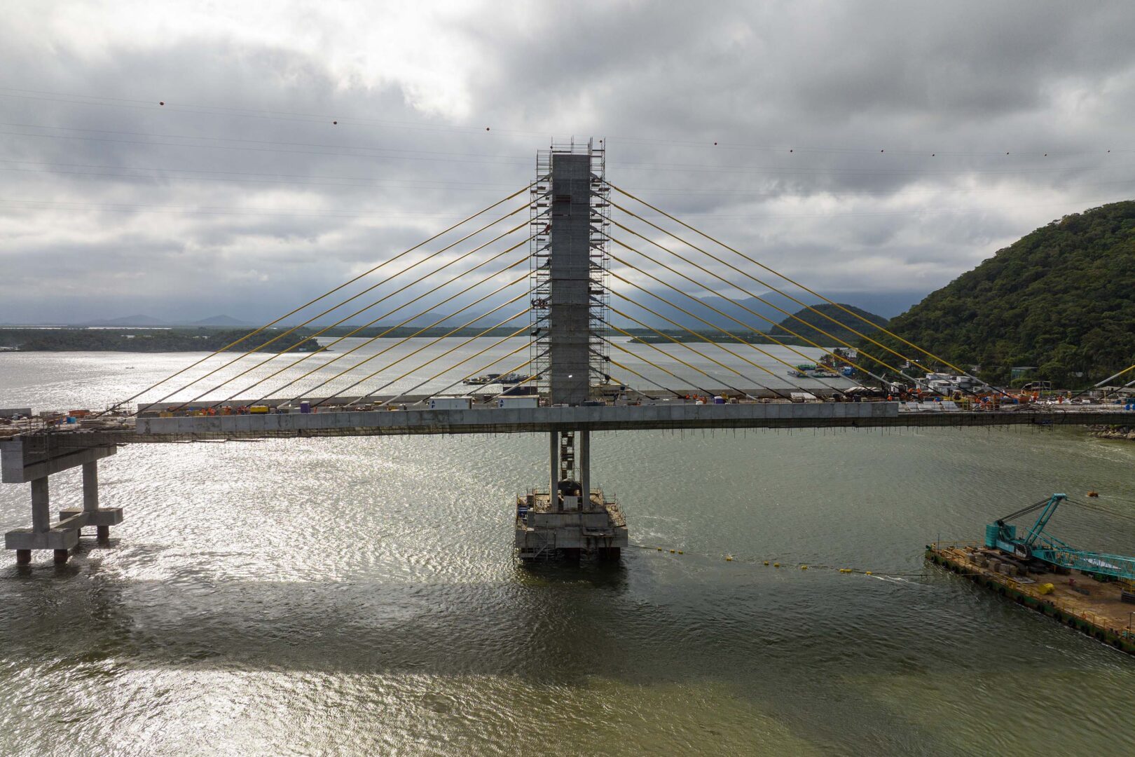 O trecho estaiado, identificado pelos cabos de sustentação, foi concluído no mês passado, o que permitiu o avanço da pavimentação da pista. A estrutura utilizada na concretagem foi retirada. No vão central, caminhões-guindastes estão realizando a movimentação das peças de concreto dos guarda-corpos e das barreiras entre as faixas.