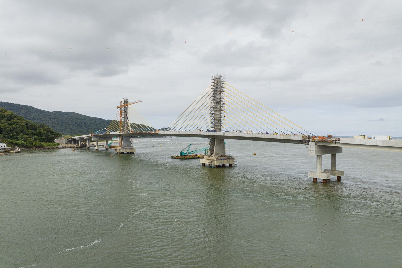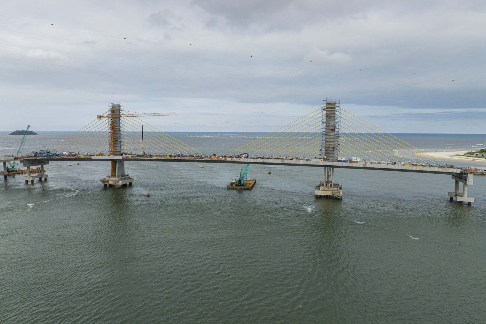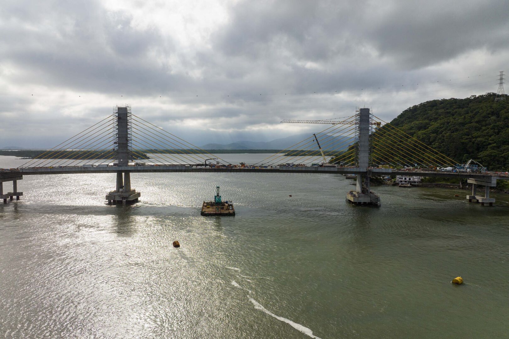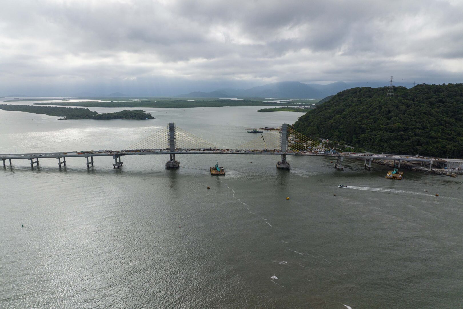 O trecho estaiado, identificado pelos cabos de sustentação, foi concluído no mês passado, o que permitiu o avanço da pavimentação da pista. A estrutura utilizada na concretagem foi retirada. No vão central, caminhões-guindastes estão realizando a movimentação das peças de concreto dos guarda-corpos e das barreiras entre as faixas.