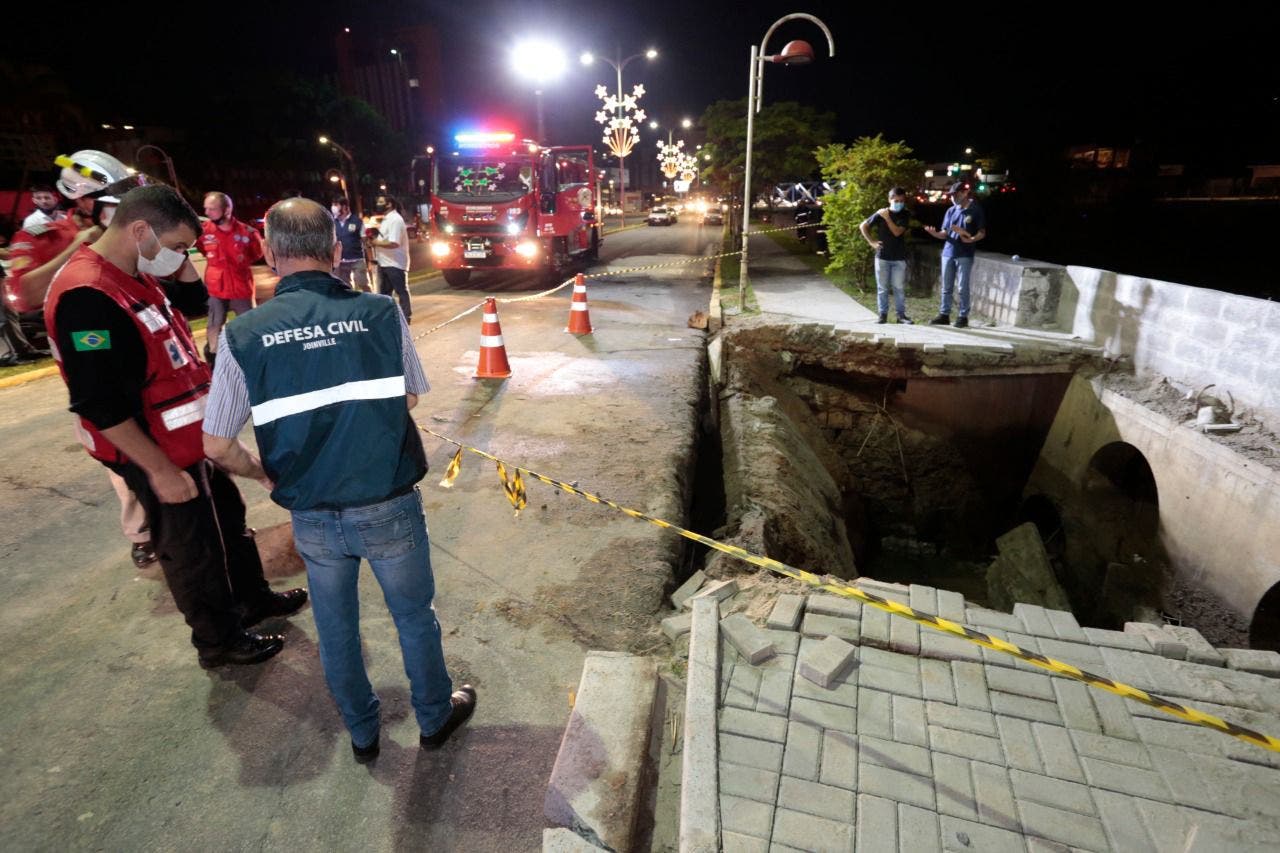 > Calçada cede e pessoas caem no rio Cachoeira em abertura do Natal em Joinville