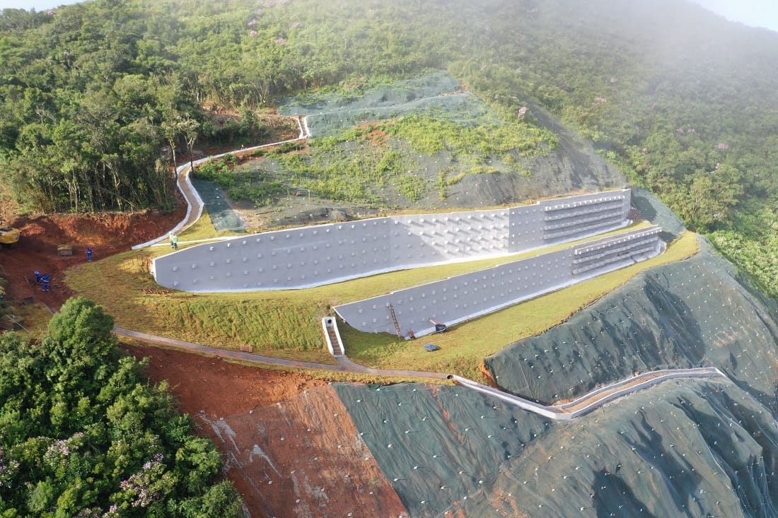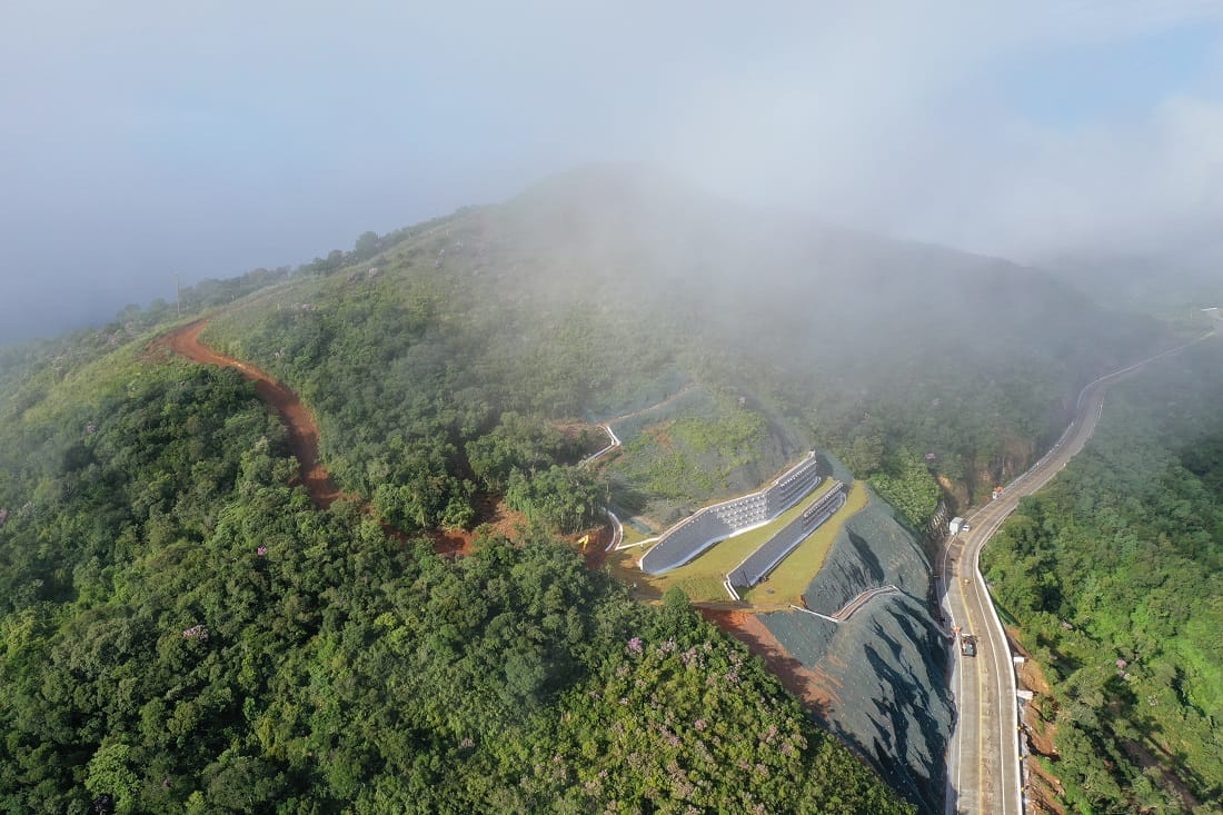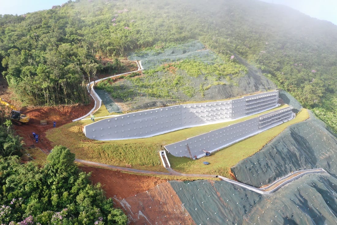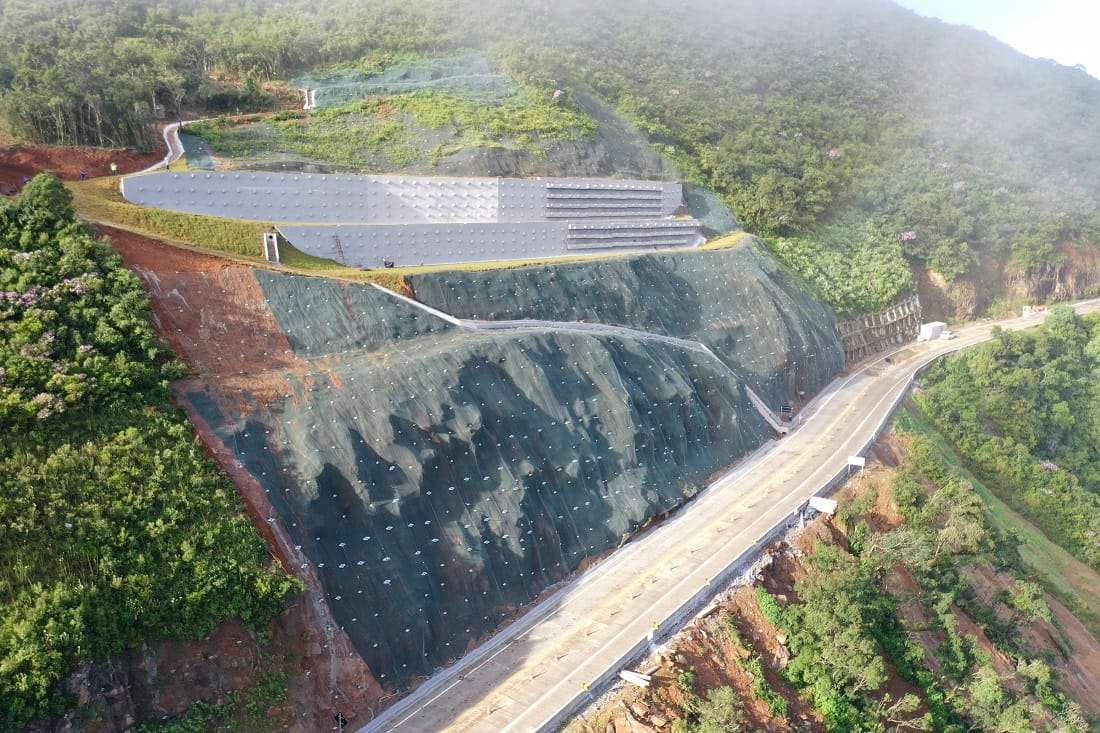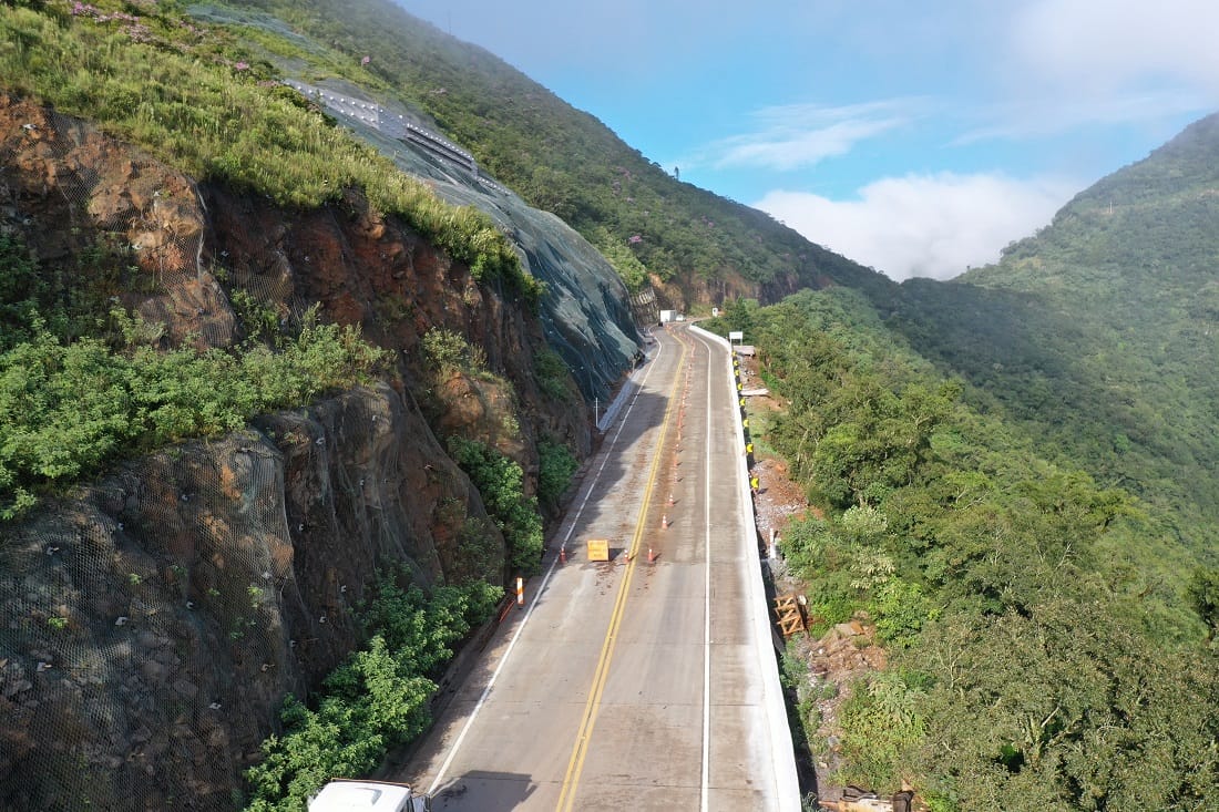 Houve paralisação dos trabalhos em 2024, após deslizamento de maciço. No início do ano passado, houve a retomada, com implantação de contenção com 50 metros de altura, em investimento de R$ 57 milhões. A técnica empregada foi de cortina atirantada, com muros de concreto com tirantes fazendo a contenção.