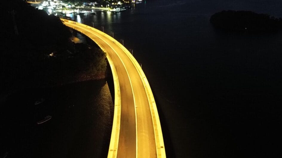 O projeto de iluminação tem a instalação de 211 postes na ponte e acessos. A metade foi implantada, principalmente do lado de Guaratuba – o trecho de Matinhos está em fase inicial. A divulgação informa que os testes vão avançar para outras áreas, com o trecho estaiado como etapa final.