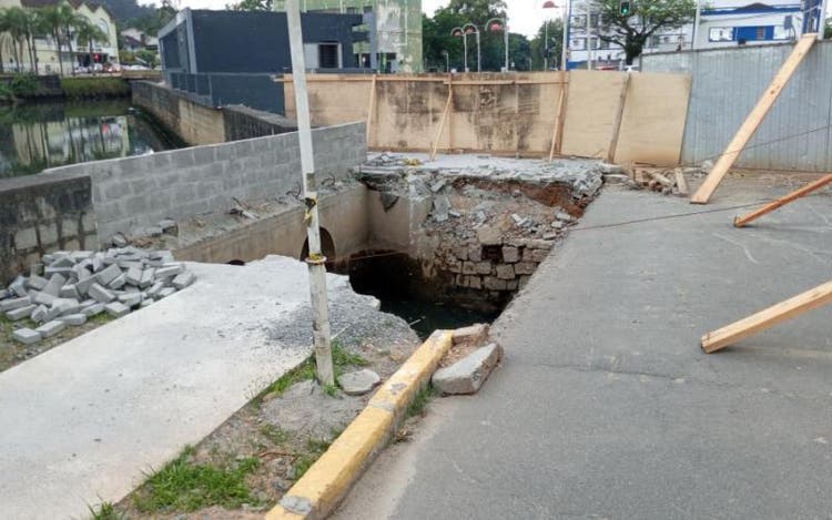 A queda da calçada deixou pelo menos 33 pessoas feridas. O acidente, com causas ainda sendo apuradas, ocorreu em ponto ao lado do rio Cachoeira, sobre galeria antiga do rio Mathias. O projeto enviado ao Legislativo não cita os valores pretendidos para a indenização, ainda a serem definidos. A prefeitura pretende oferecer um valor único para a indenização por danos morais. Eventuais danos materiais terão cálculo específico.
