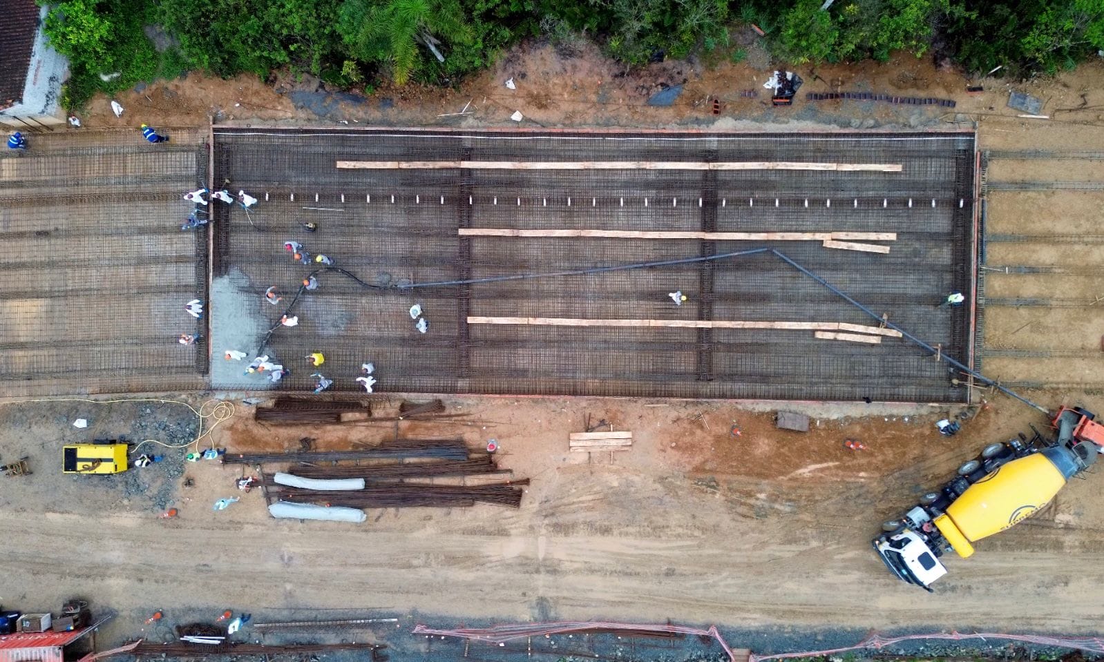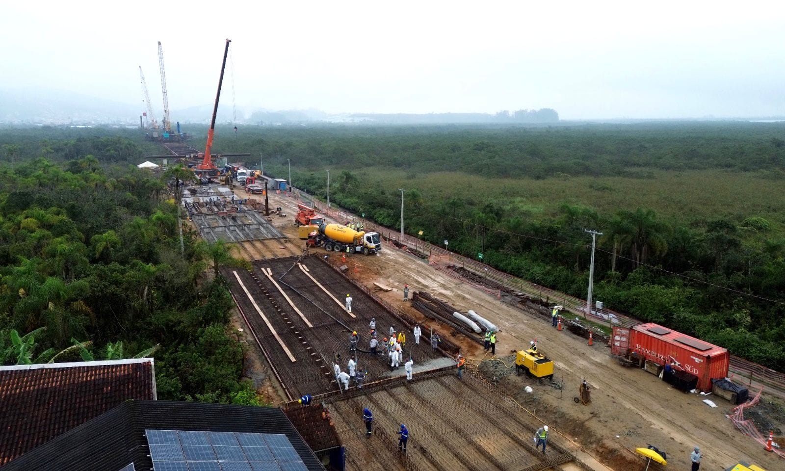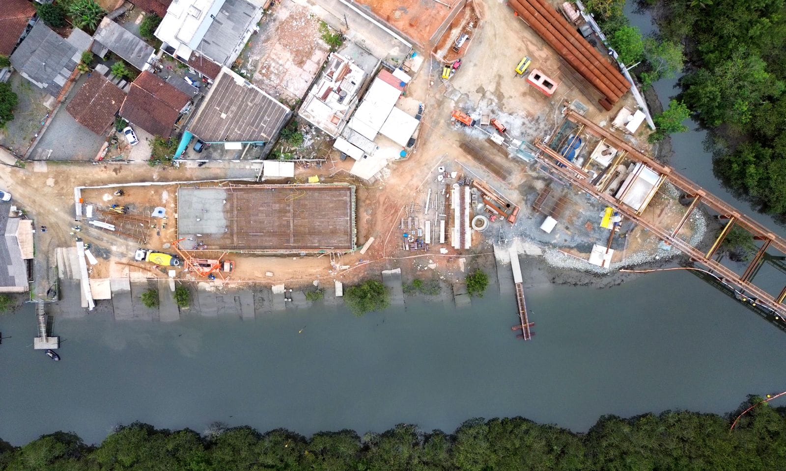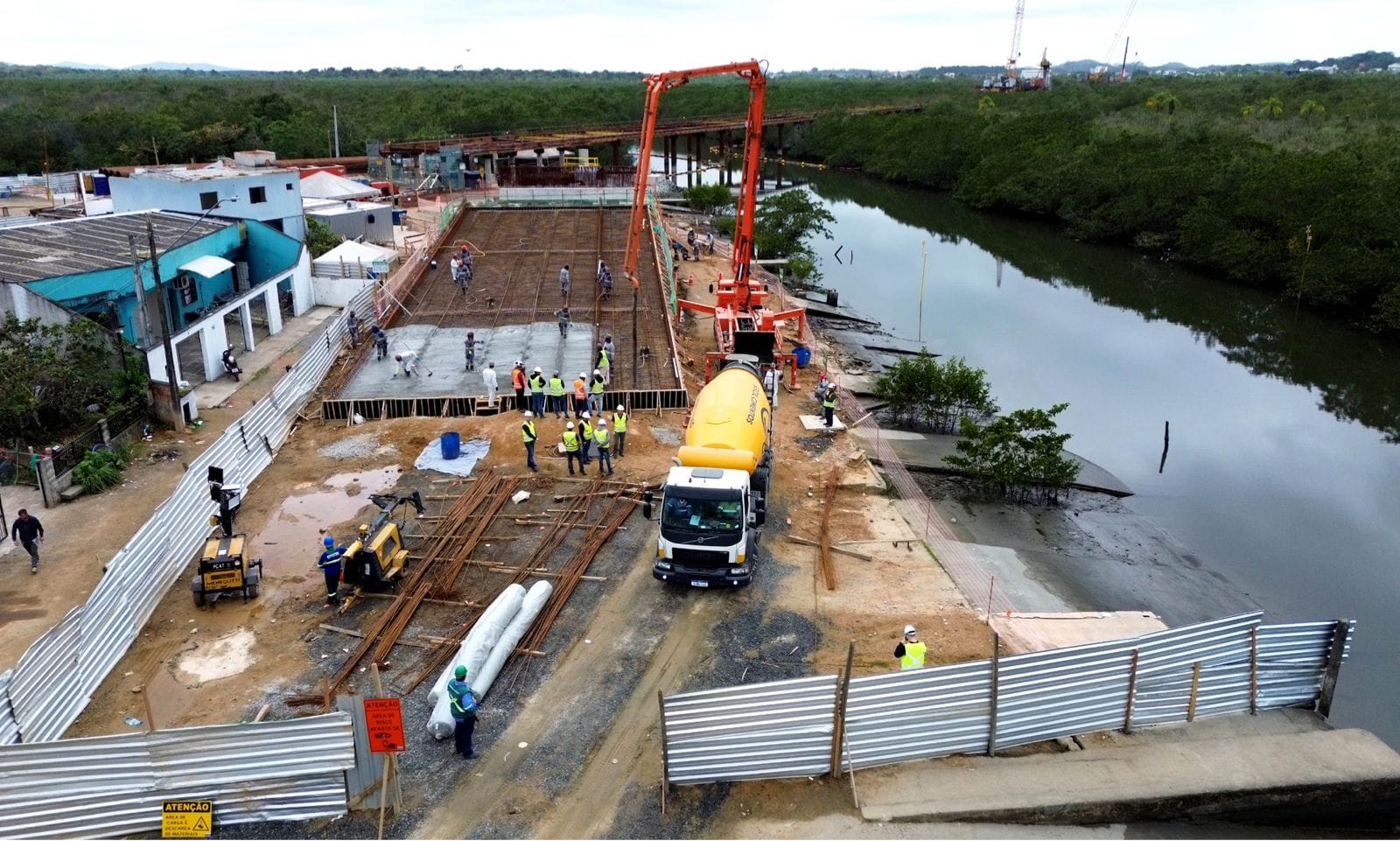A ponte de 980 metros entre os bairros Adhemar Garcia e Boa está em obras desde o final do ano passado, com previsão de conclusão em janeiro de 2027. A fabricação de vigas de concreto é uma das frentes de trabalho. No local da ponte, estão sendo preparadas as fundações, com obras dos dois lados da ponte.