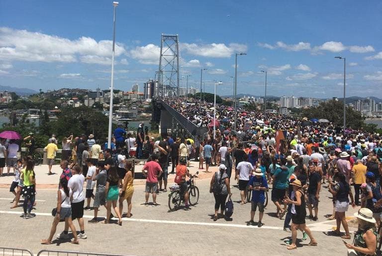 Toda a celebração que marcou a manhã, os breves discursos do governador Carlos Moisés (PSL) e do prefeito florianopolitano Gean Loureiro (DEM), o belo desfile de carros antigos, tudo isso foi mero pedágio para a verdadeira festa: a das pessoas. Milhares de pessoas invadiram… minto, não é invasão se houve o convite. Milhares de pessoas tomaram a ponte – ou melhor, retomaram – antes mesmo do fim da solenidade, começando a cruzá-la pelas passarelas.