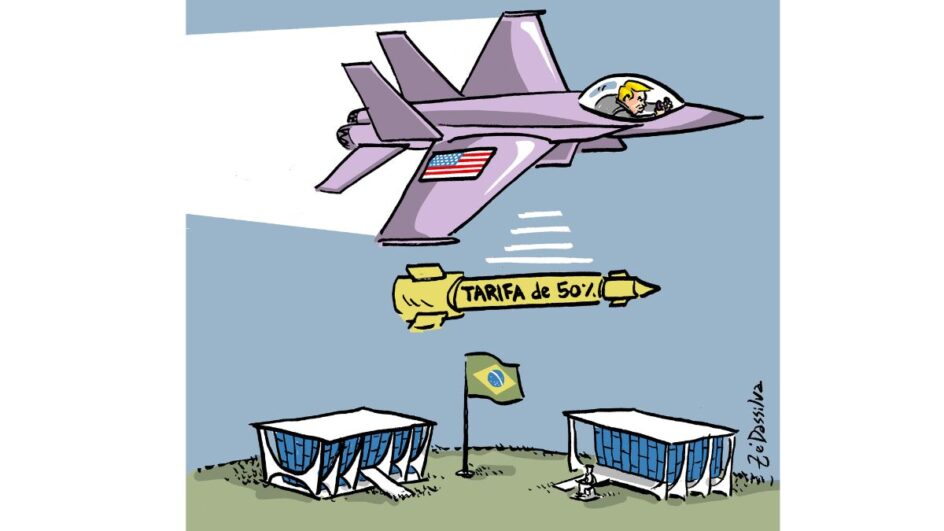 A charge de Zé Dassilva deste fim de semana repercute as tarifas de 50% impostas pelo presidente dos EUA, Donald Trump, contra as exportações do Brasil.