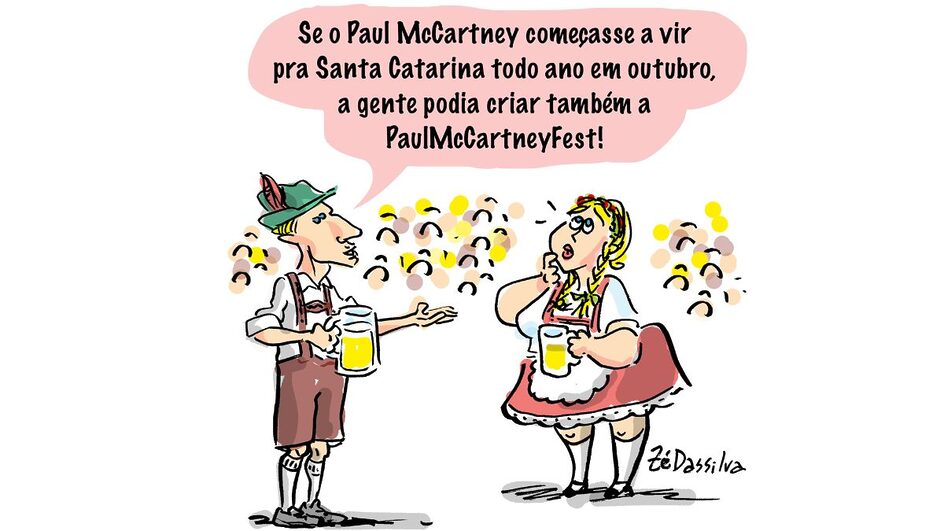 A charge de Zé Dassilva deste fim de semana repercute a vinda de Paul a Santa Catarina no mês das festas. O show do astro inglês aconteceu no último sábado (19) no Estádio da Ressacada, no Sul da Ilha de Santa Catarina, mesmo local em que se apresentou em 2012.
