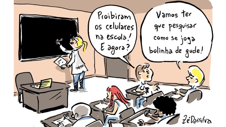 A charge de Zé Dassilva deste fim de semana repercute a proibição dos celulares nas escolas.