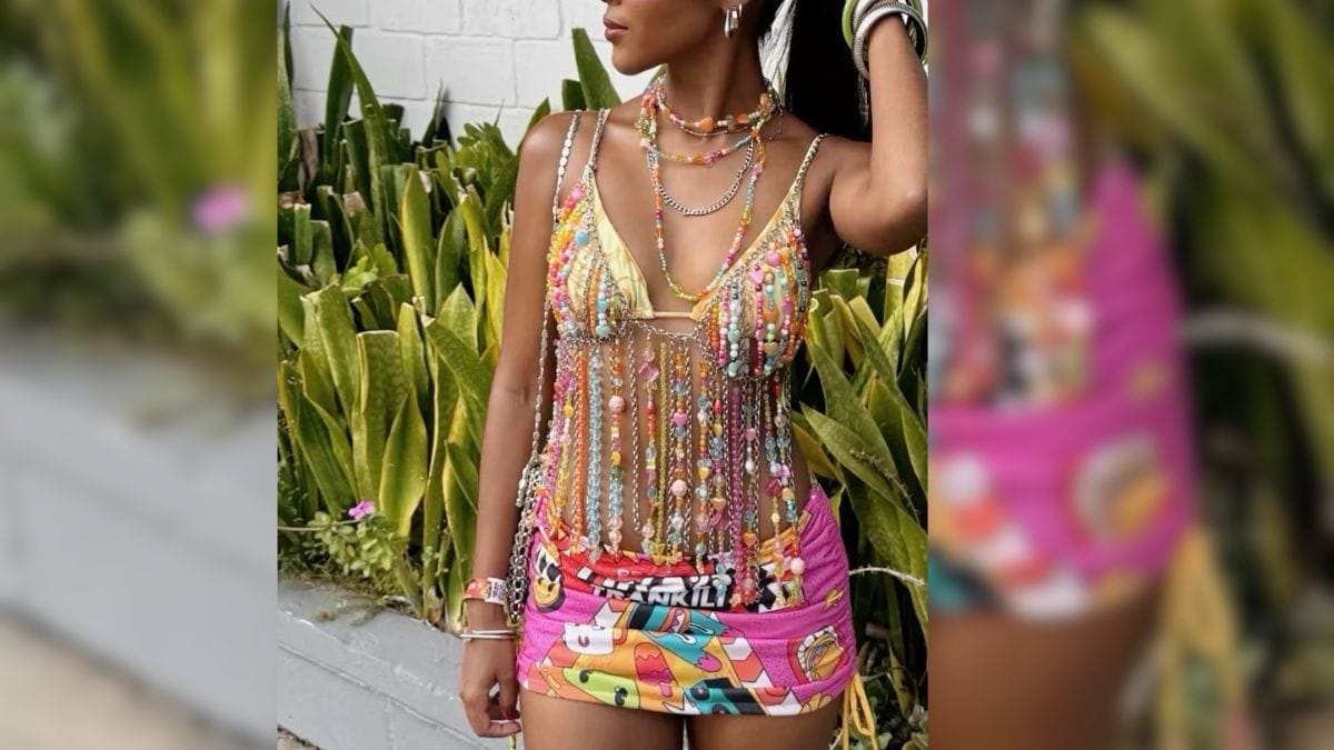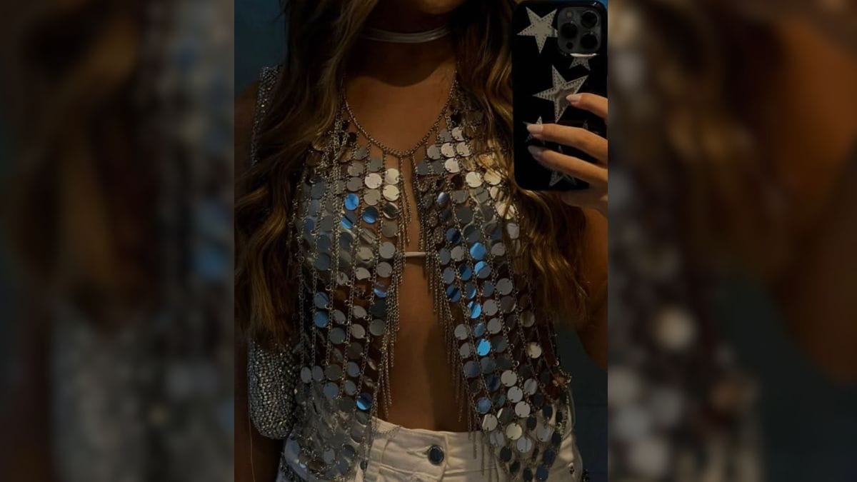 Looks metalizados e brilhantes devem fazer sucesso durante os dias de folia em 2026. A sugestão é combinar um biquíni simples com acessórios metalizados para criar um visual festivo instantâneo.