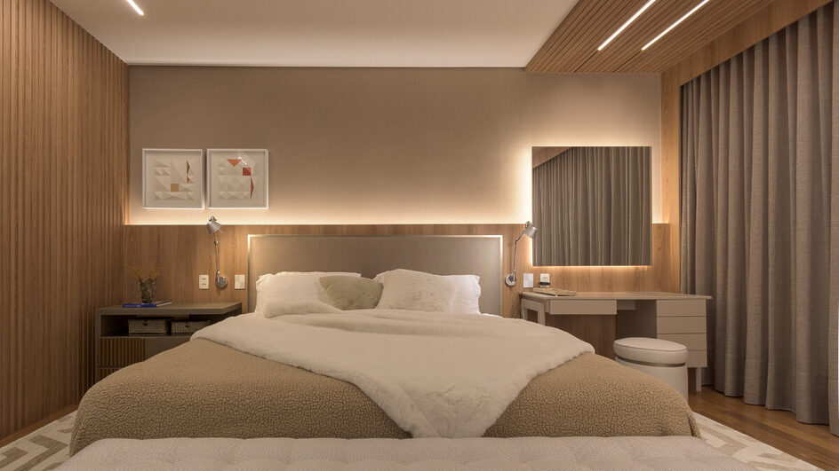Serenidade e relaxamento são as tônicas da iluminação para os dormitórios. De modo geral, o ambiente deve contar com lâmpadas de cores quentes, com temperatura entre 2700K a 3000K, acrescida por luzes indiretas, categoricamente posicionadas.